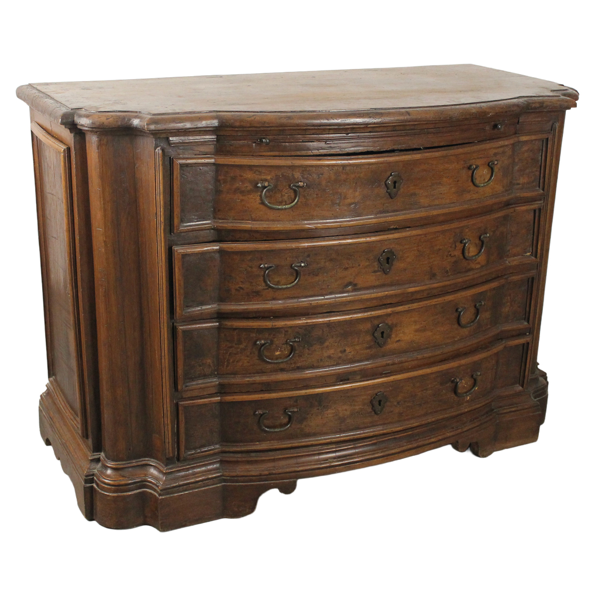 Gilded wood carved with ornamental motifs with pine cone at the end and faux jasper lacquering. Top in red marble (marble from a later period). Sicily. XVIII century. 55x23 cm h 40