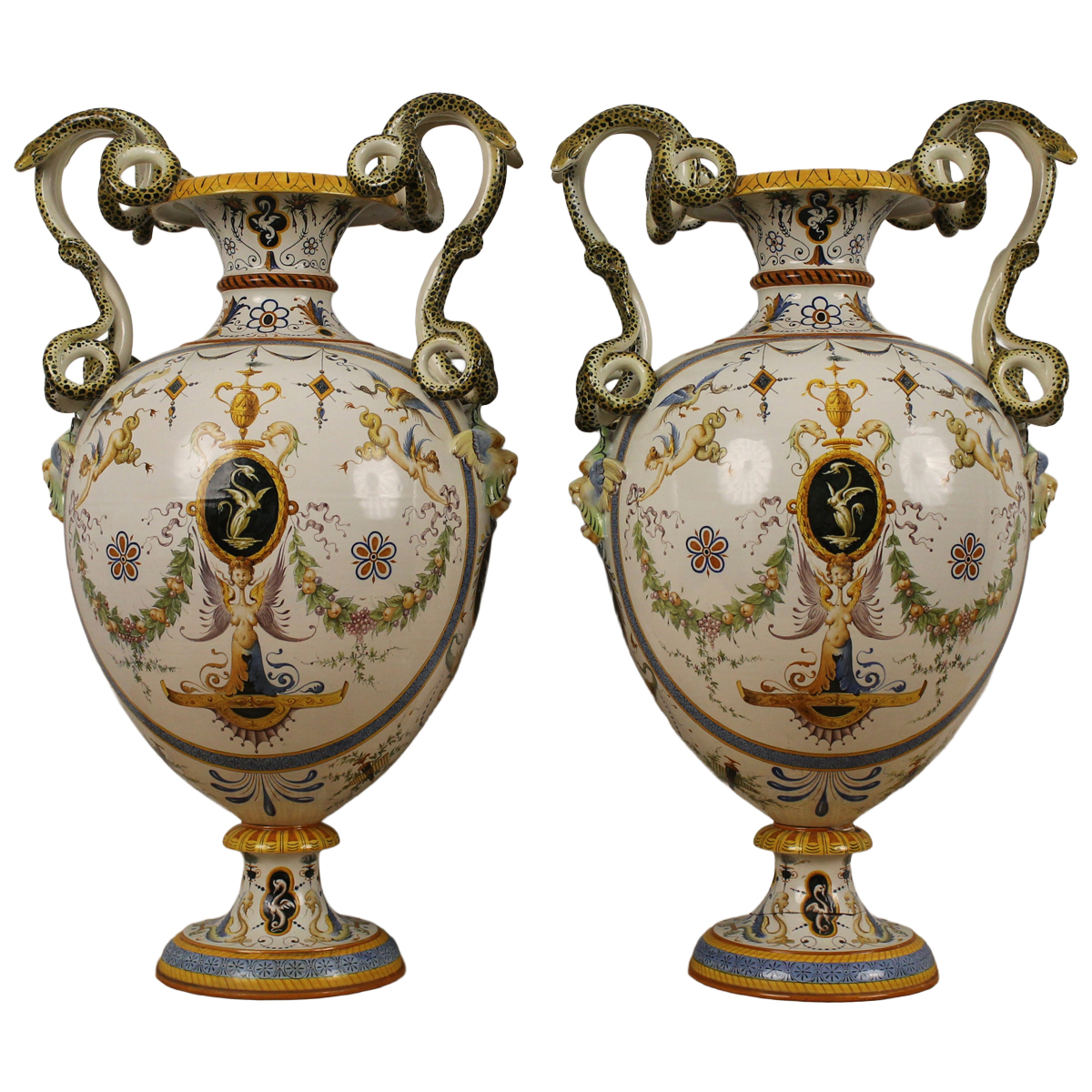 € 250Maiolica riccamente decorata con scene classiche e motivi ornamentali e vegetali sul retro (rotture alla base di uno dei due). Ginori. Secolo XX. Cm h 74