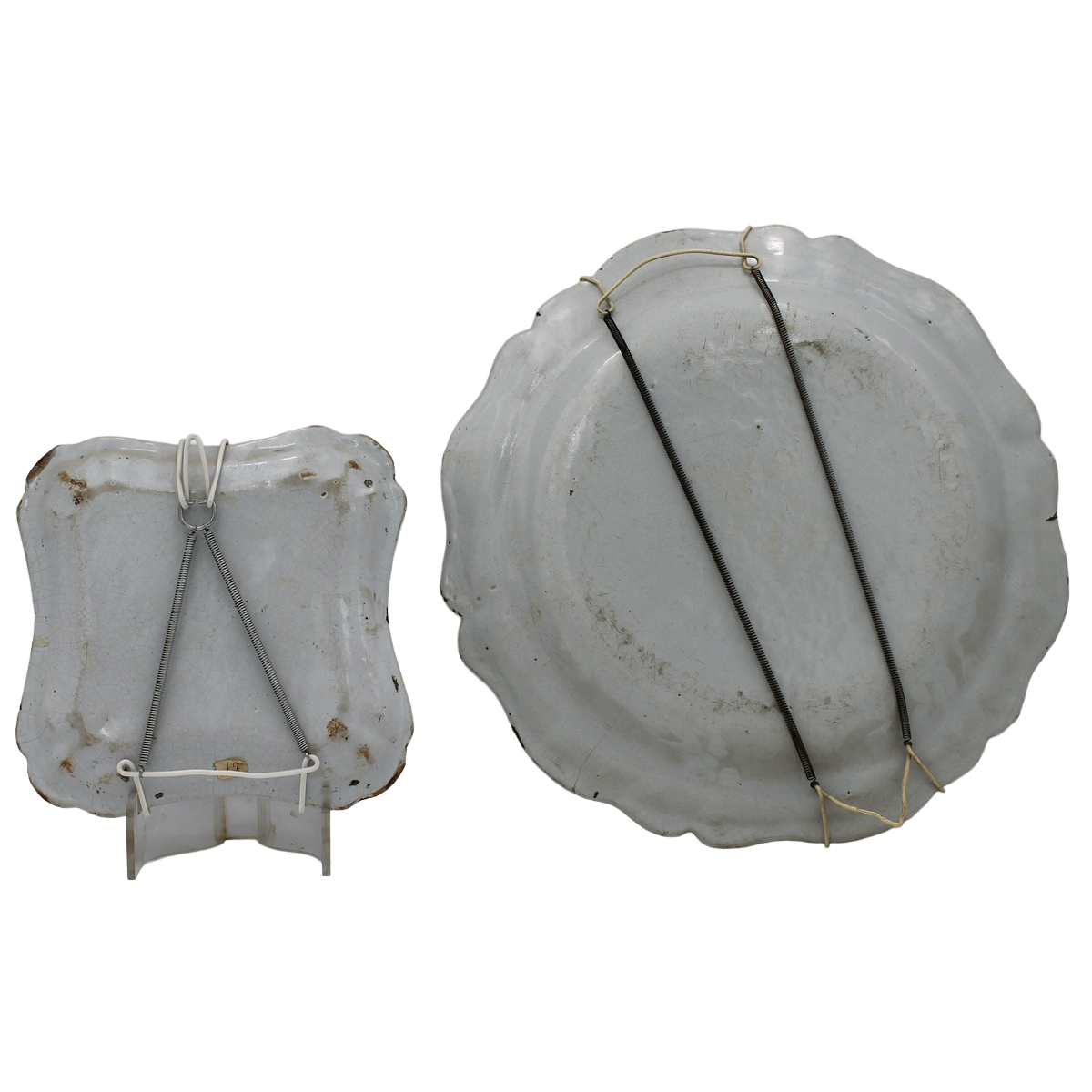 € 100Antica maiolica con decoro geometrico policromo su fondo bianco. Italia centrale. Inizi secolo XIX. Cm d 35,5 (piatto); cm d 26 (vassoio)