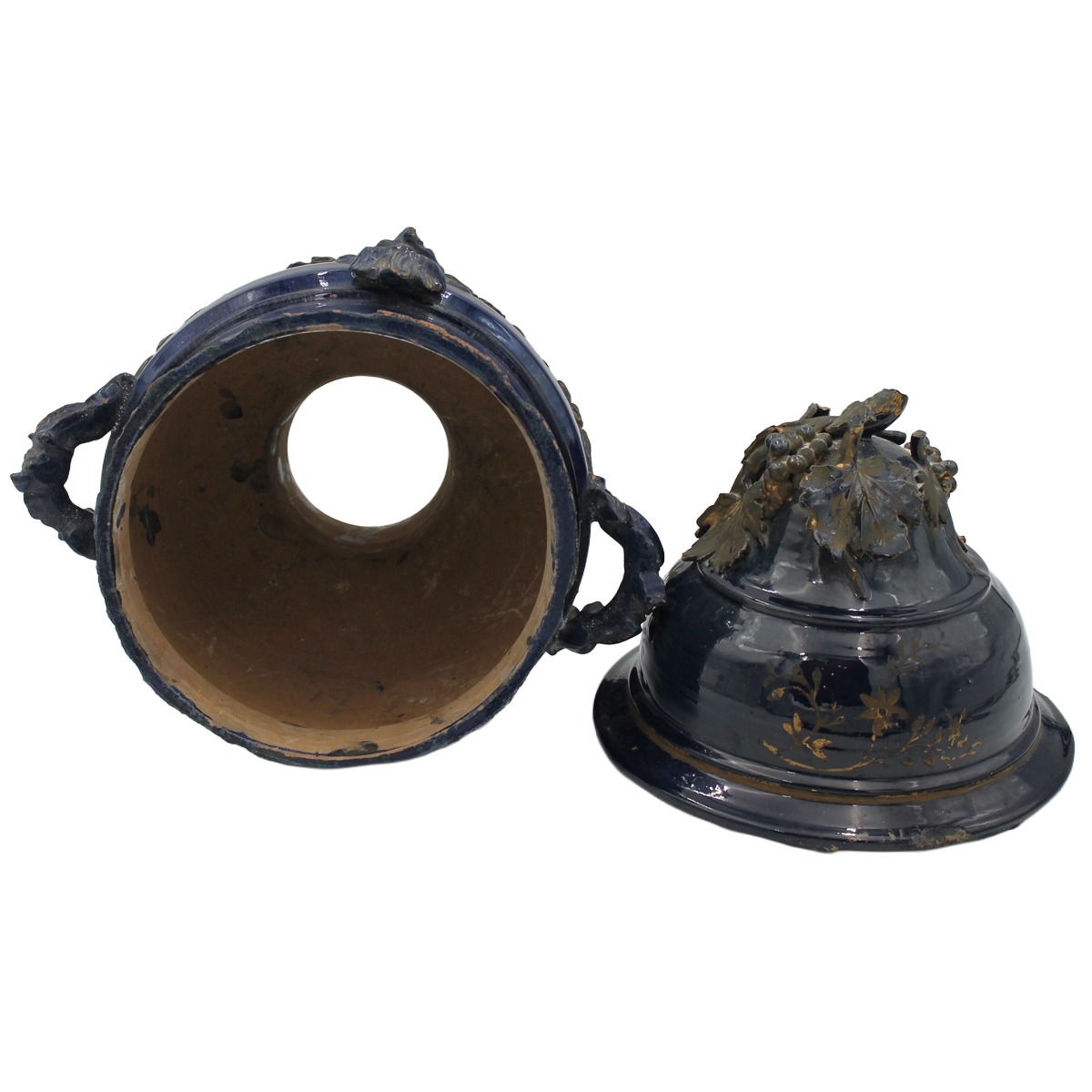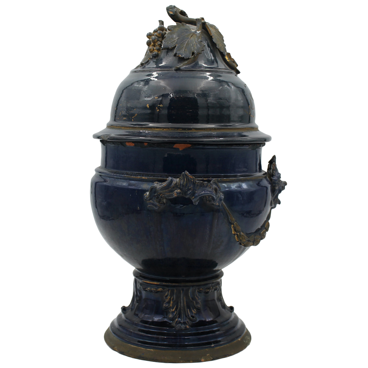 € 2.000Antica maiolica con decoro a motivi vegetali, tralci d'uva e mascheroni dorati su fondo blu cobalto (mancanze, sbeccature e lievi restauri). Sperlinga. Inizi secolo XIX. Cm h 45