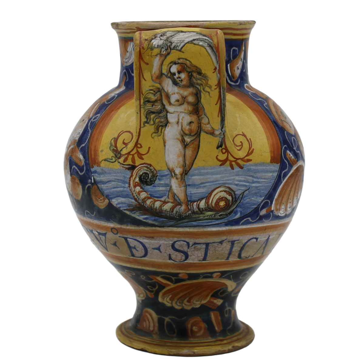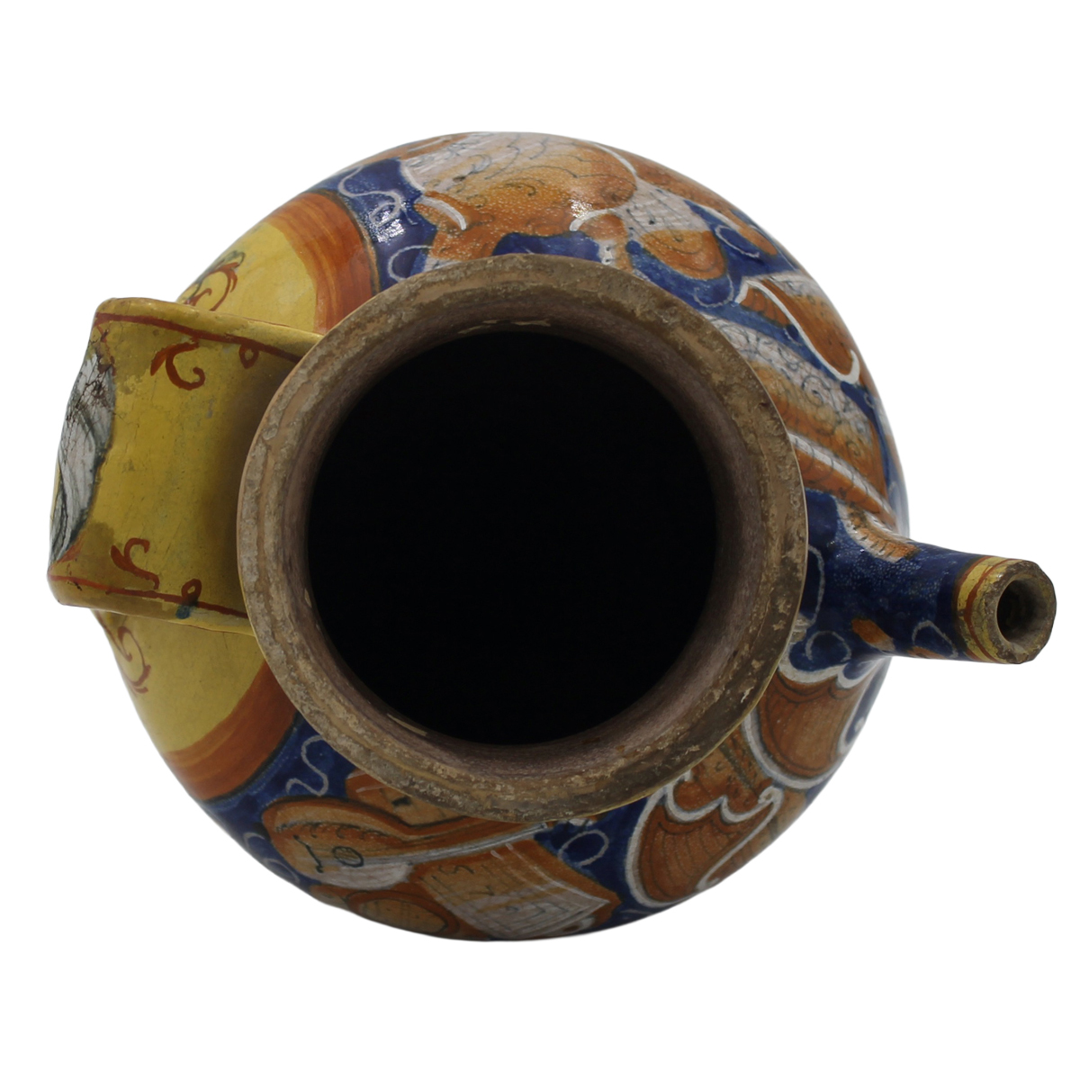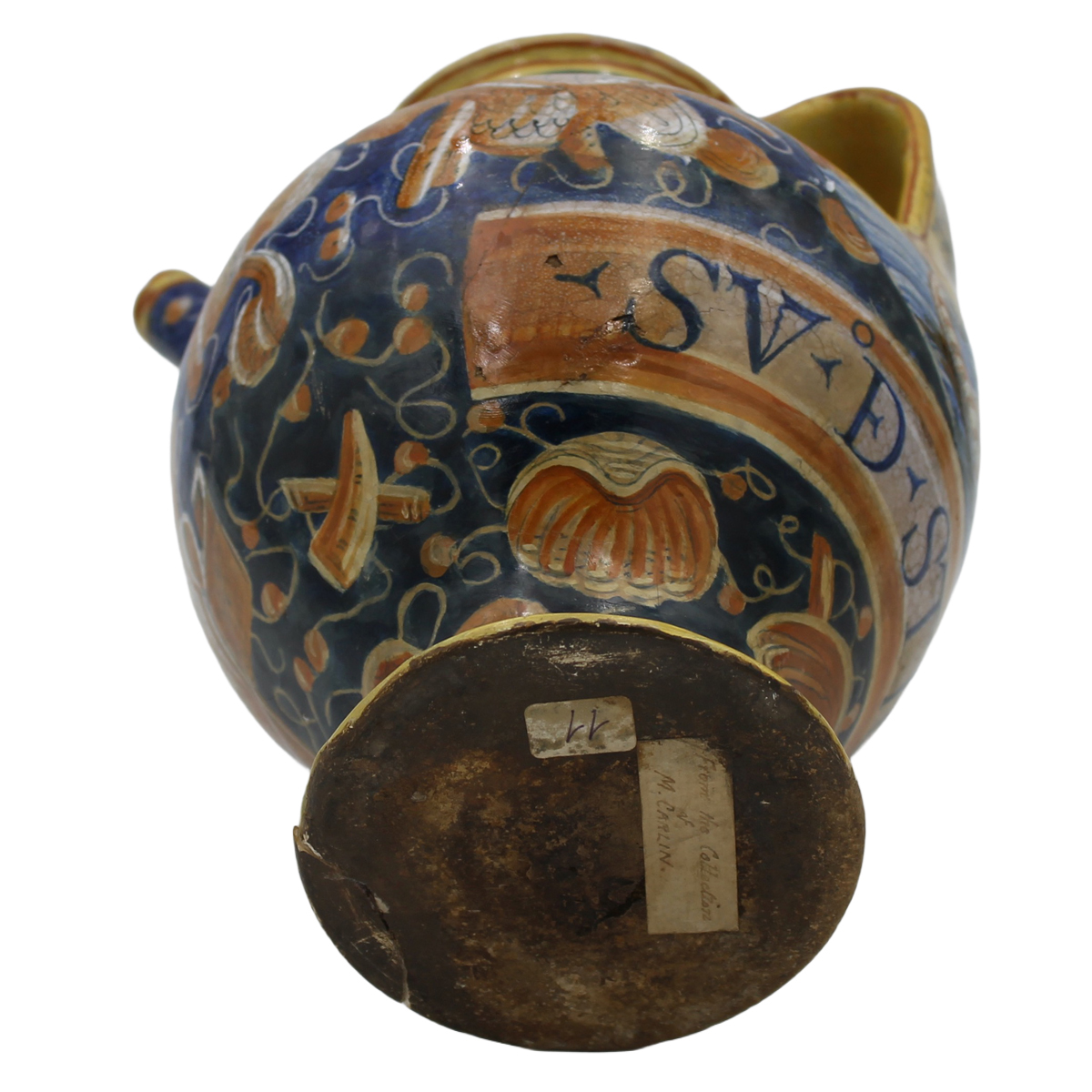 € 600Antica maiolica con decoro a tutto tondo a trofei e sul manico figura di Venere, iscrizioni nella parte centrale (importanti restauri e ricostruzioni nella parte inferiore). Casteldurante. Datata 1579. Cm h 23