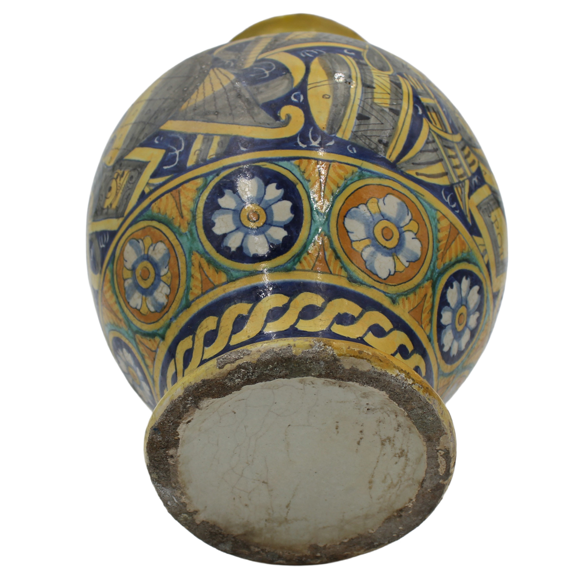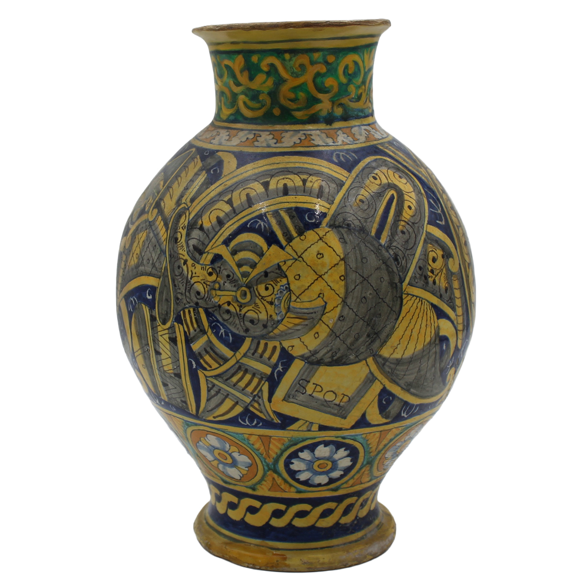€ 2.000Antica maiolica con figura di Santo in preghiera sul fronte e sul retro ricco decoro a trofei e motivi geometrici (evidenti restauri sul collo, lievi restauri nella parte centrale e piccoli restauri alla base). Palermo. Siglata SPQP. Inizi del secolo XVII. Cm h34,5