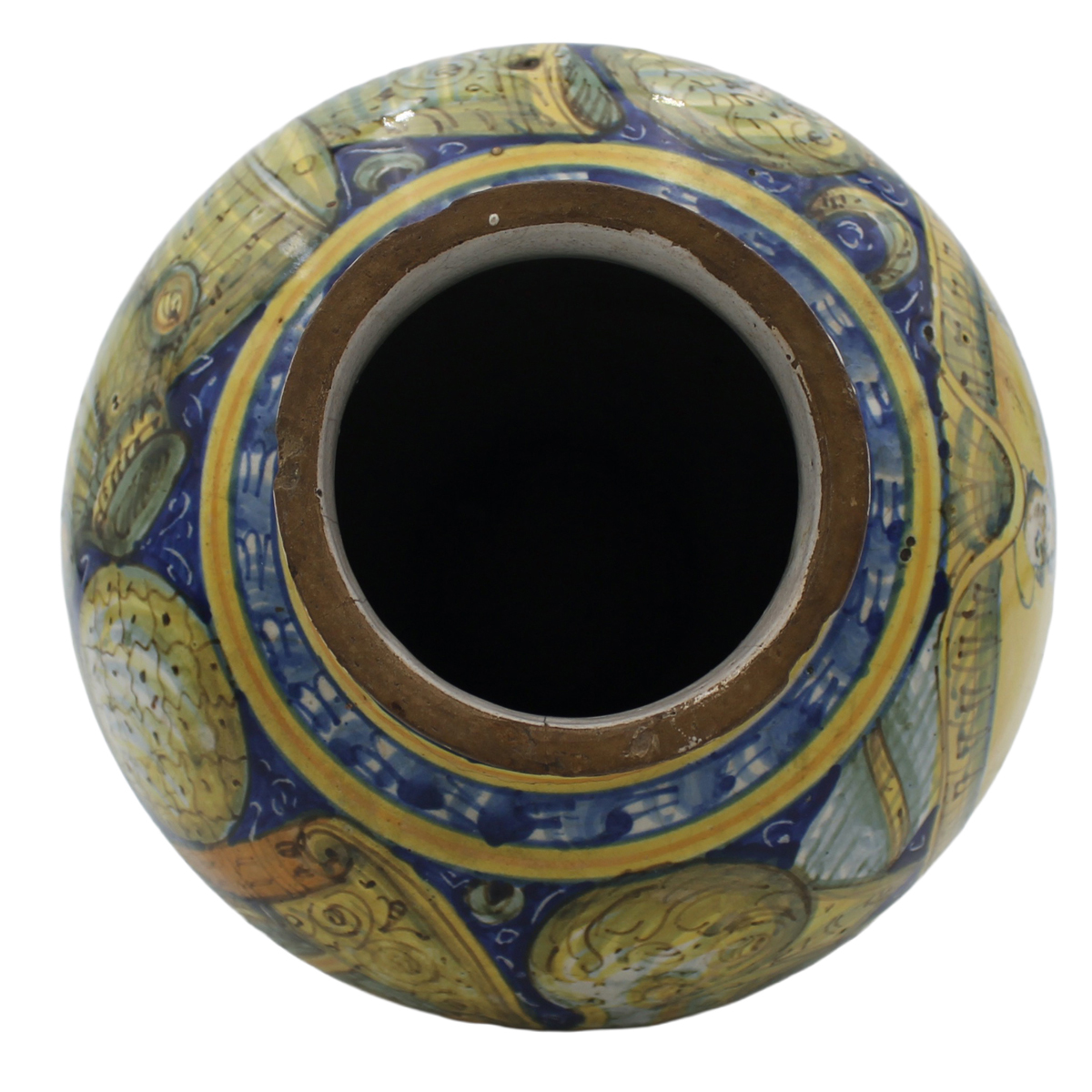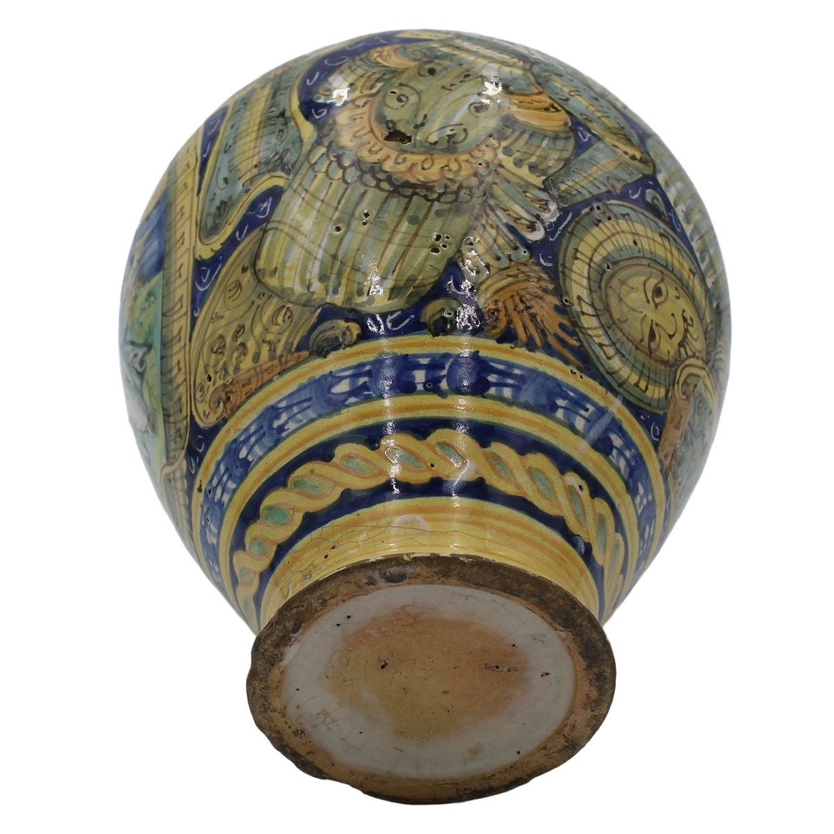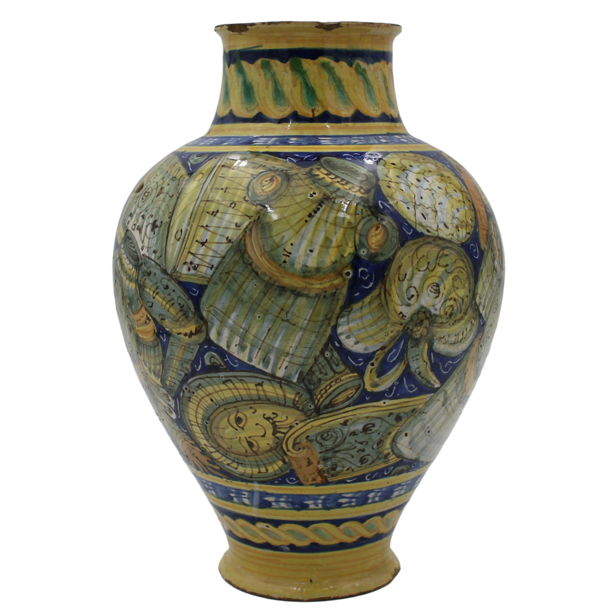 € 3.000Antica maiolica con Santo sul fronte e decoro sul retro a trofei e mascheroni (failure sul collo e lievi failure alla base). Palermo. Inizi del secolo XVII. Cm h 34