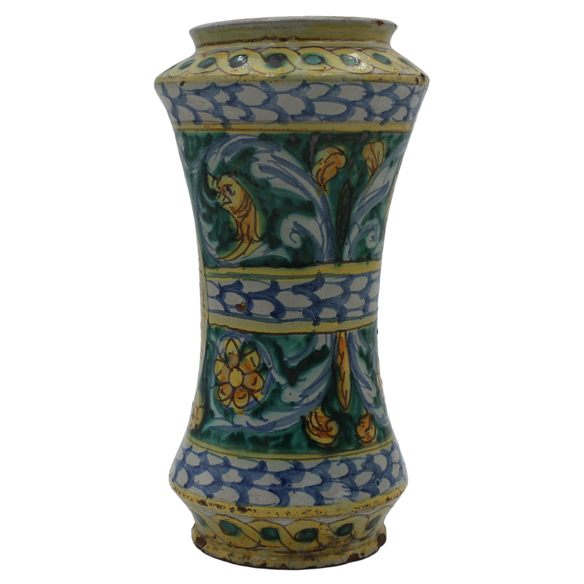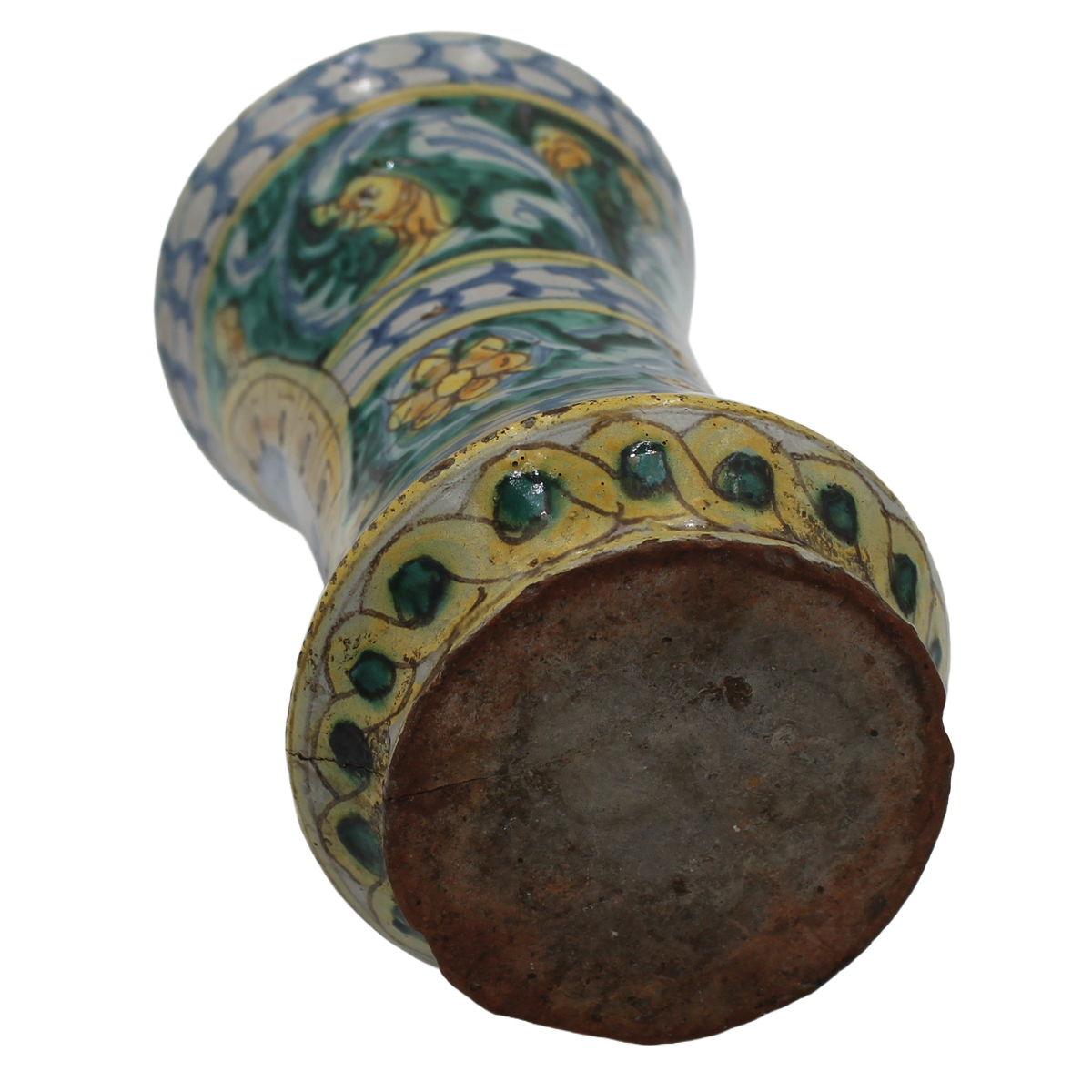 € 1.500Antica maiolica con sul fronte Santa Rosalia e sul retro decoro a motvi floreali e vegetali policromi (importante failure dal centro al piede). Sciacca. Secolo XVII. Cm h 29,5