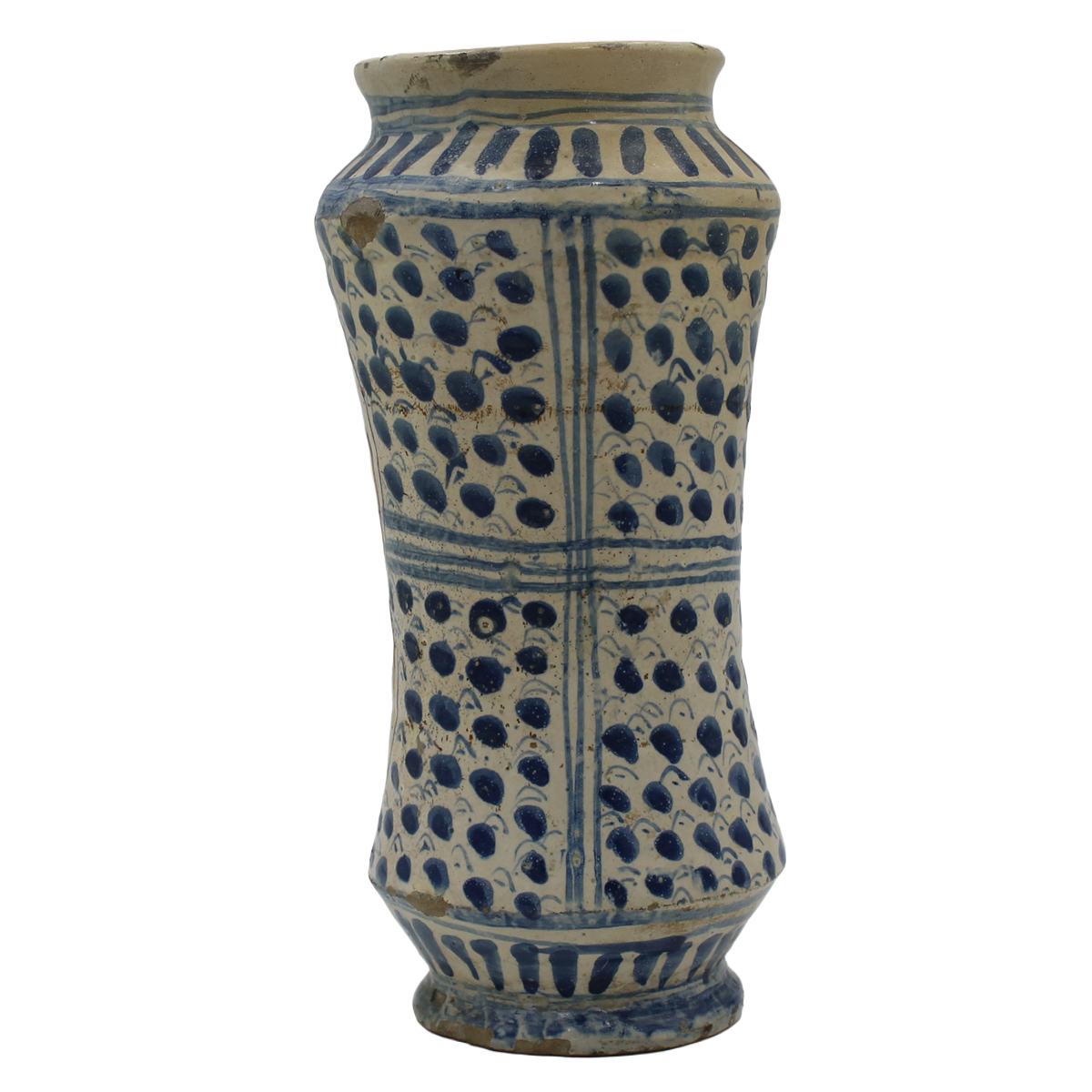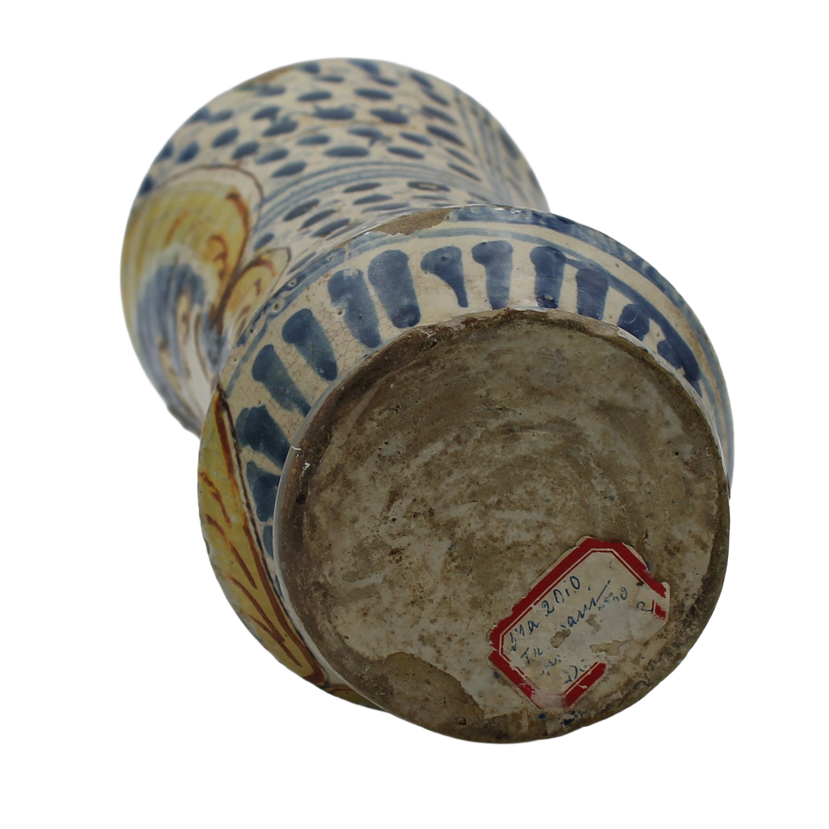€ 600Antica maiolica con decoro frontale raffigurante putto contornato da cartiglio policromo e sul retro decoro a motivi ornamentali in azzurro (lievi restauri al collo). Possibile Trapani. Secolo XVIII. Cm h 28