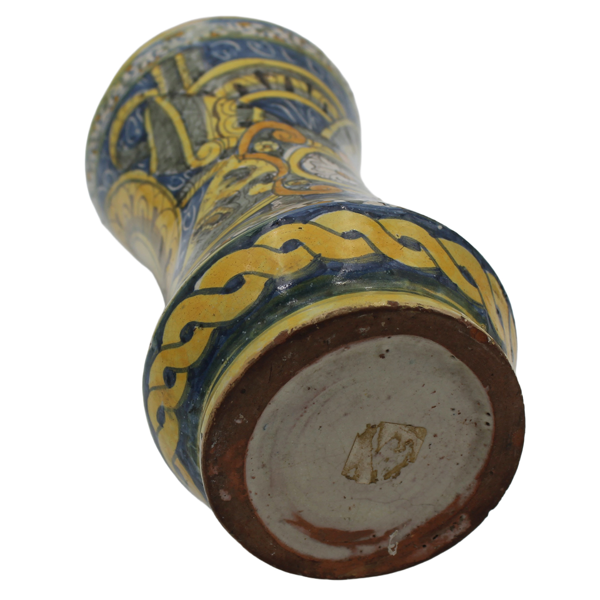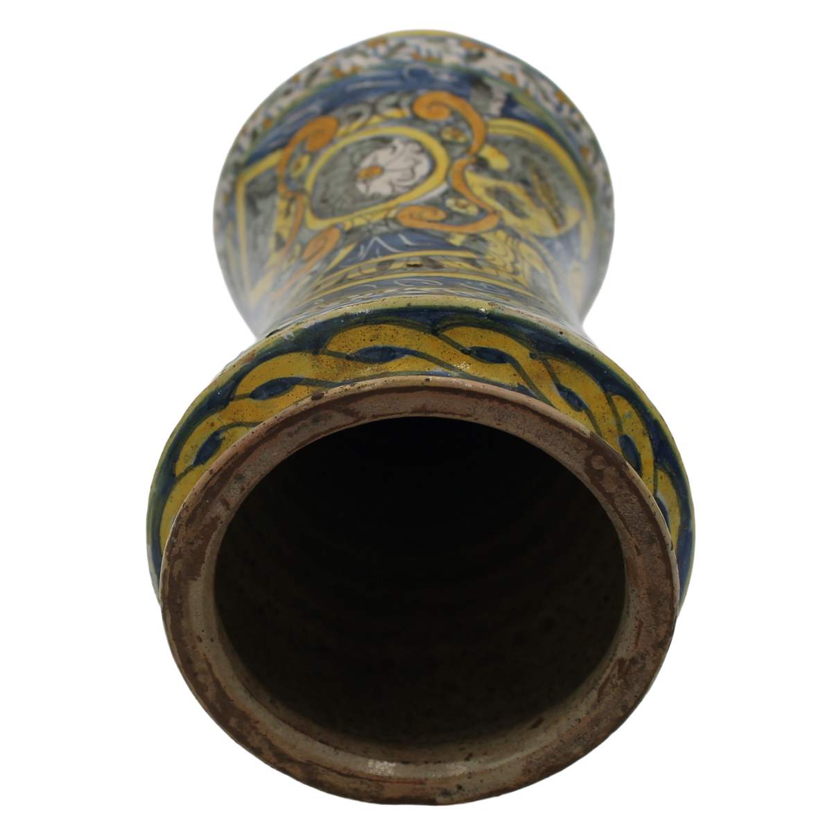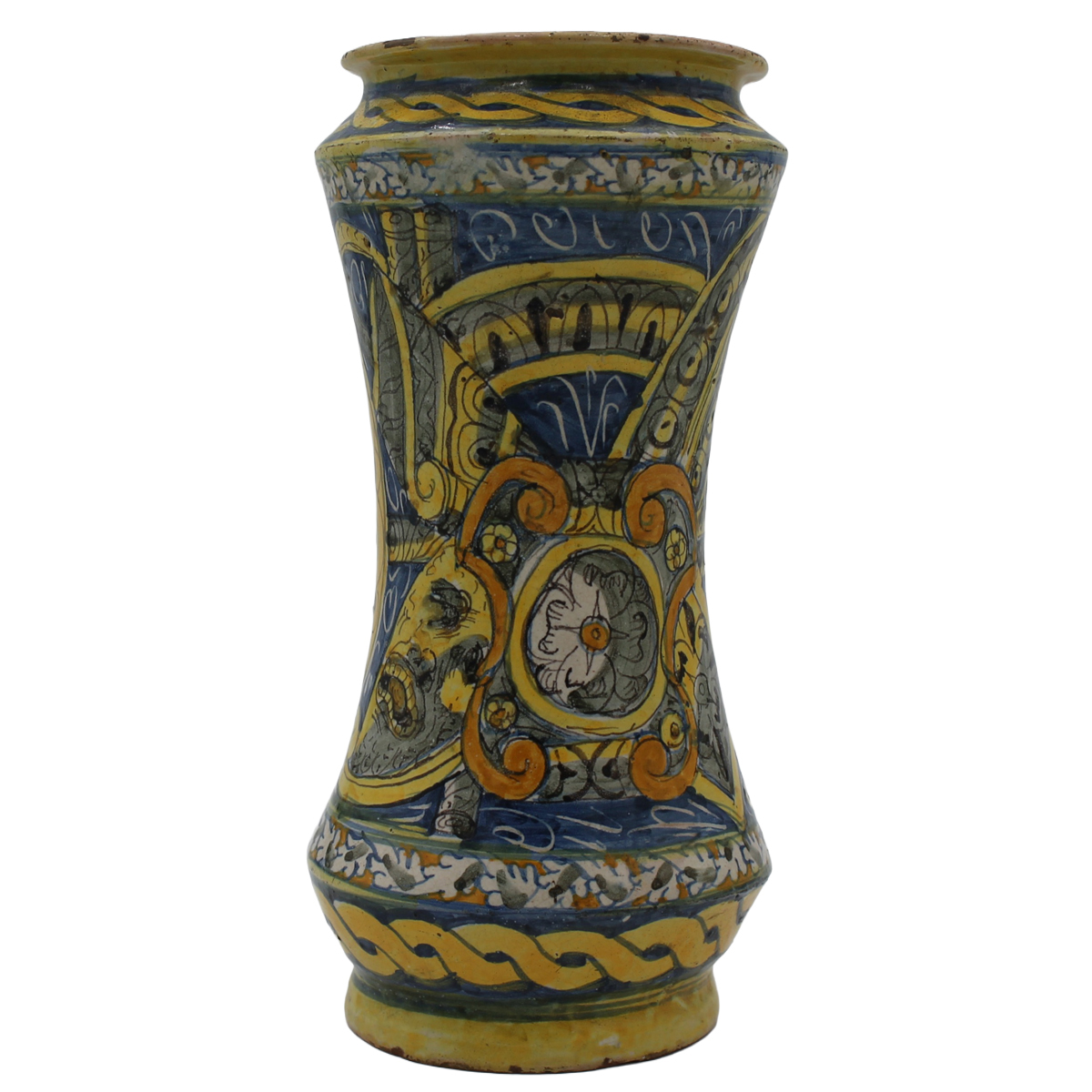 € 1.200Antica maiolica con profilo di soldato sul davanti e ricco decoro sul retro con trofei e mascheroni policromi. Palermo. Bottega Passalacqua. Secolo XVII. Cm h 30