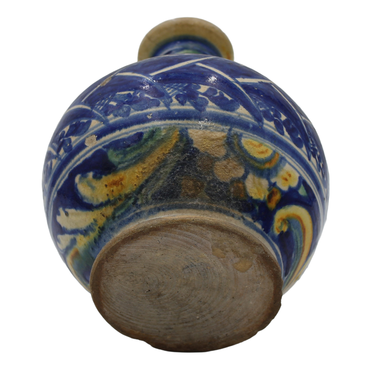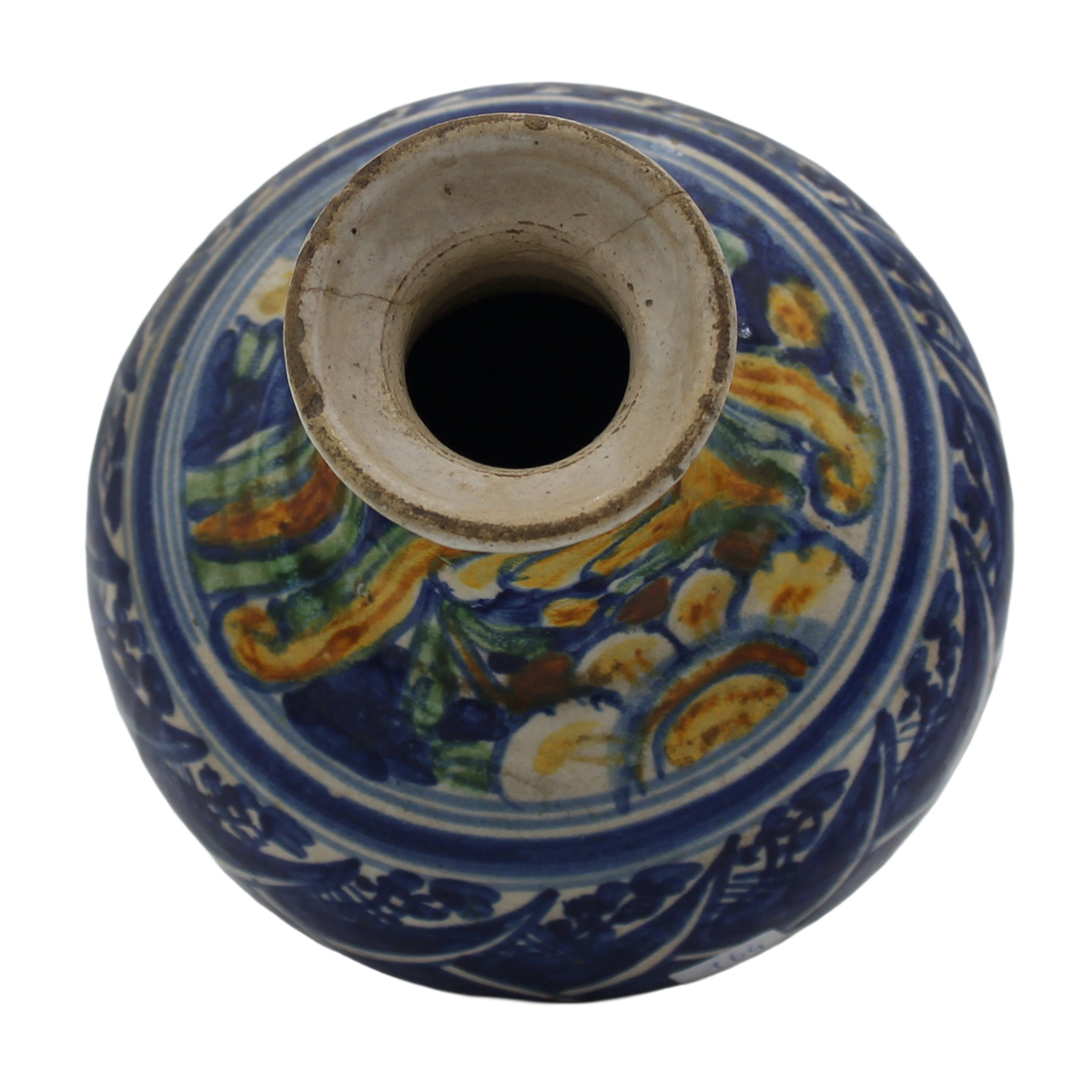 € 500Antica maiolica con decoro a tutto tondo a motivi floreali e vegetali policromi (difetto di cottura alla base e failure sul collo). Gerace Calabro. Secolo XVIII. Cm h 23