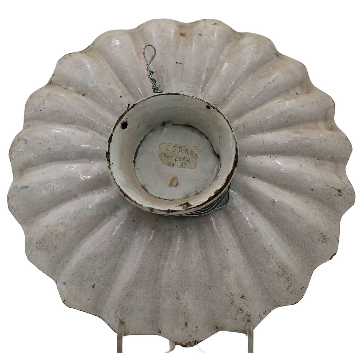 € 200Antica maiolica con decoro centrale raffigurante volatile contornato da motivi floreali policromi (piccola failure). Italia meridionale. Secolo XVIII. Cm d 28,5