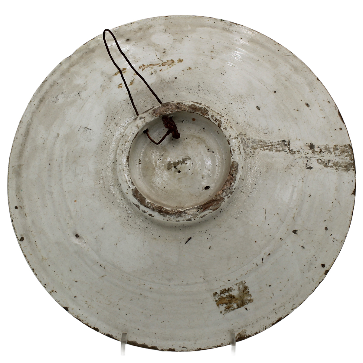 Antica maiolica con figura di Santa nella parte centrale e sui laterali decoro a motivi florali policromi. Probabile Deruta. Secolo XVII. Cm d 34