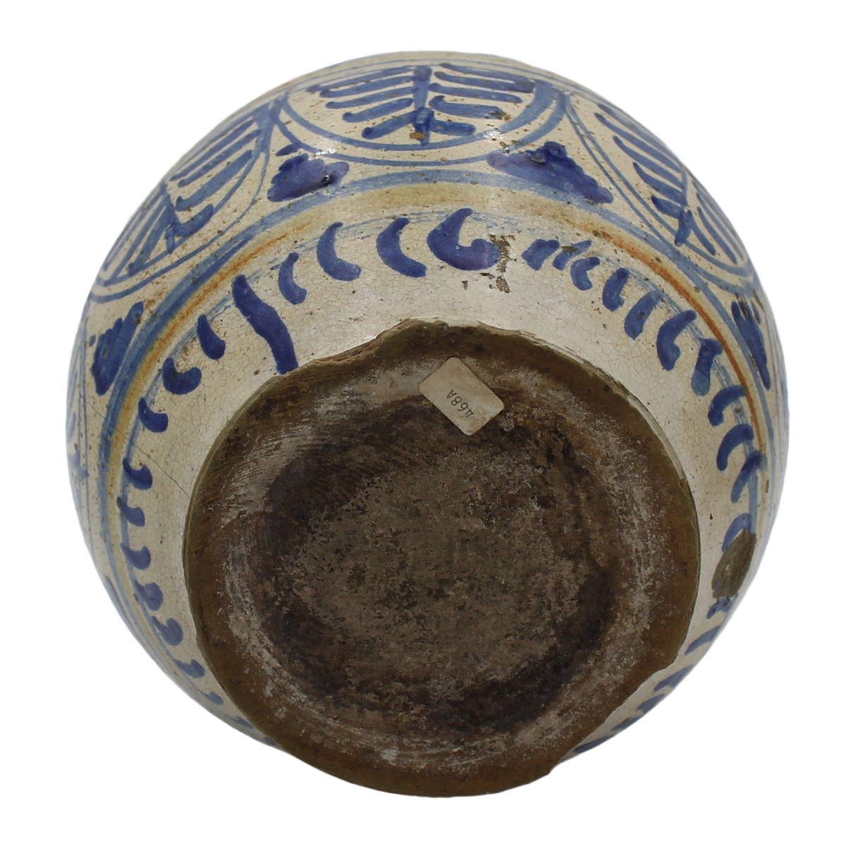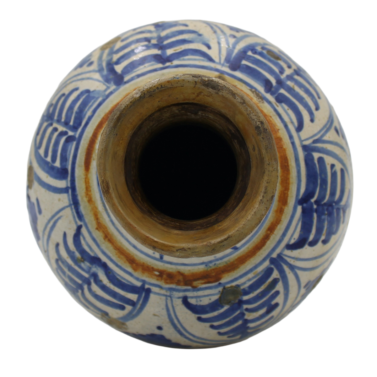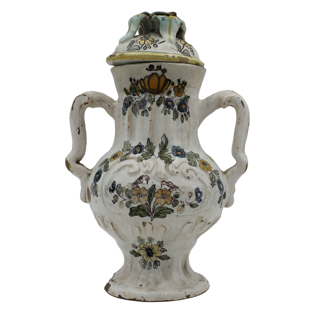 € 400Antica maiolica decorata a tutto tondo a motivi ornamentali policromi (restauri al collo). Possibile Spagna. Secolo XVIII. Cm h 29
