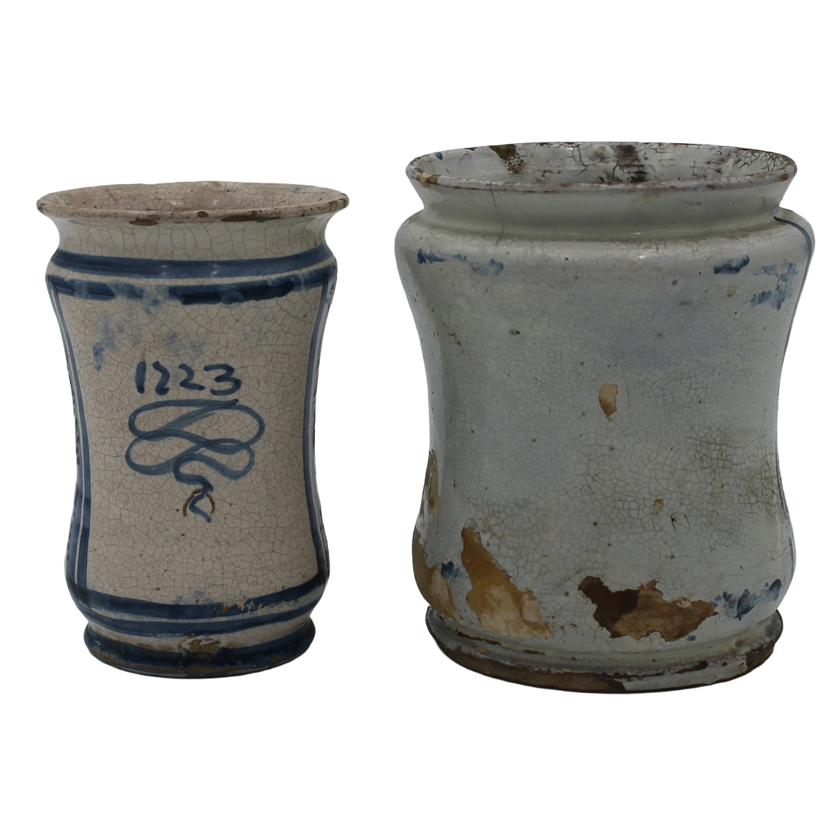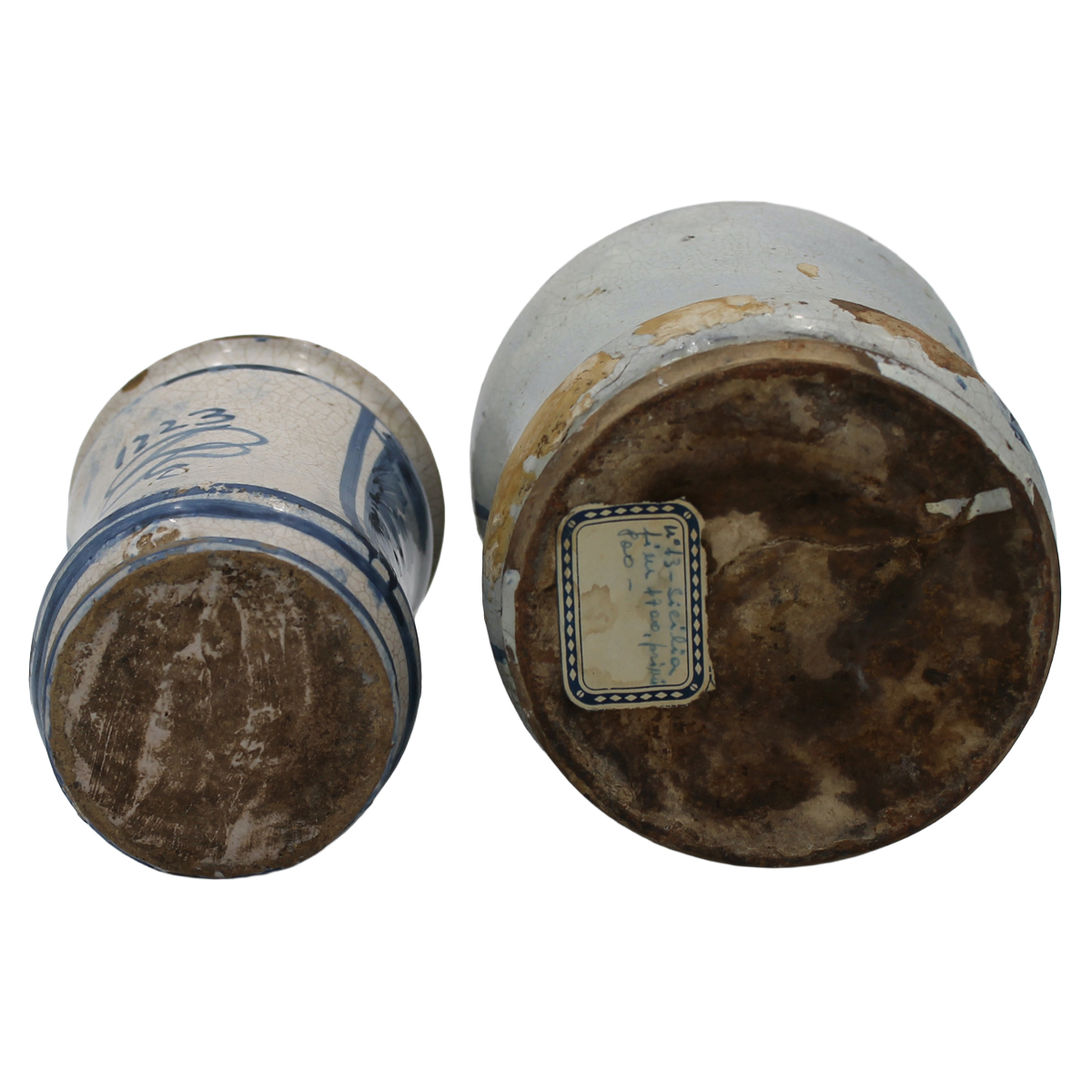€ 120Antica maiolica decorata con paesaggi e casolari. Fatture differenti. Secolo XVIII (uno dei due datato 1723). Cm h 17 (il maggiore)