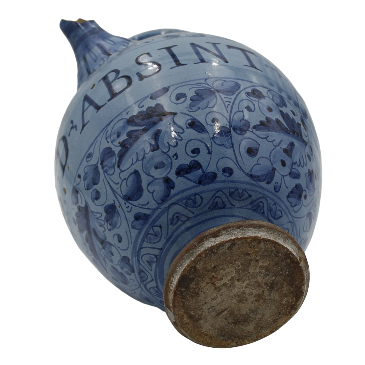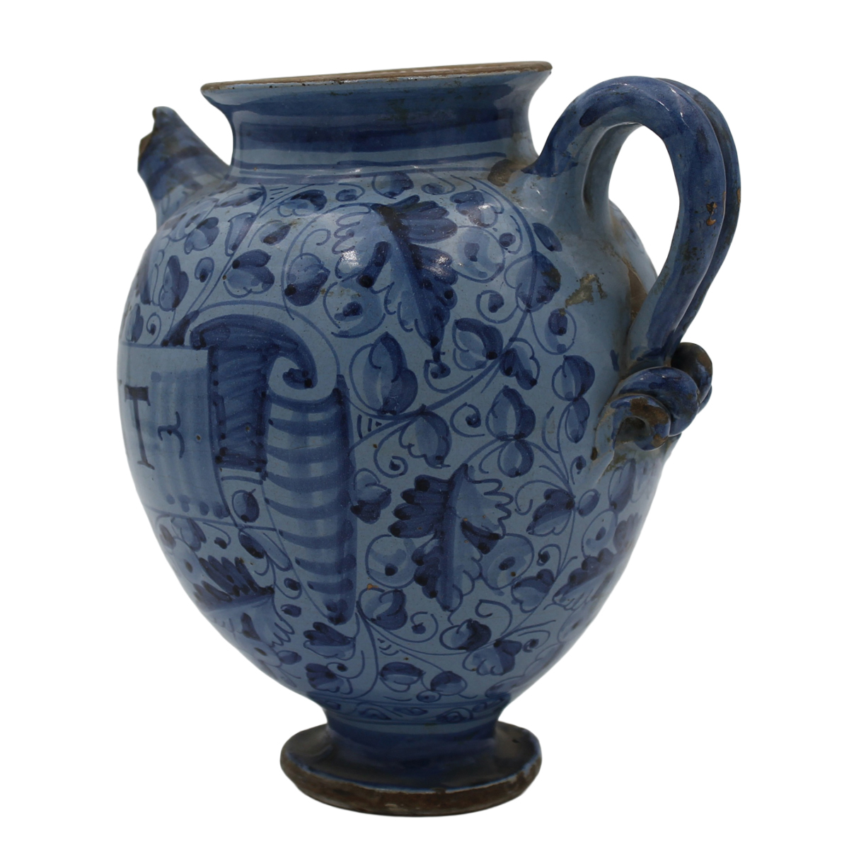 € 300Antica maiolica con iscrizione centrale e decoro a tutto tondo a motivi vegetali policromi (lievi mancanze sul beccuccio). Venezia. Secolo XVIII. Cm h 22,5