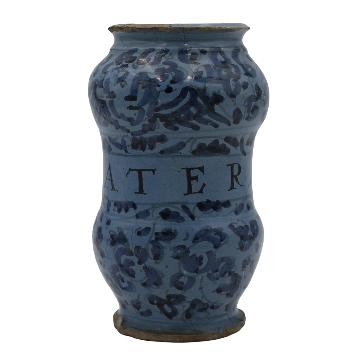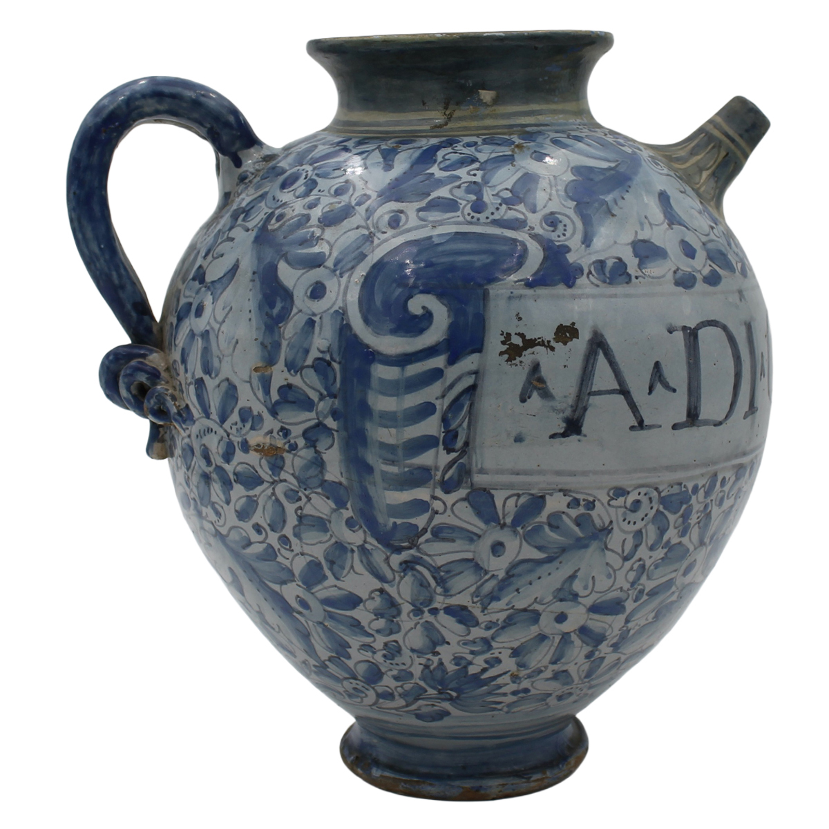 € 600Antica maiolica con decoro a motivi vegetali policromi a tutto tondo e iscrizione nella parte centrale (restauro del beccuccio e del collo). Venezia. Secolo XVIII. Cm h 36