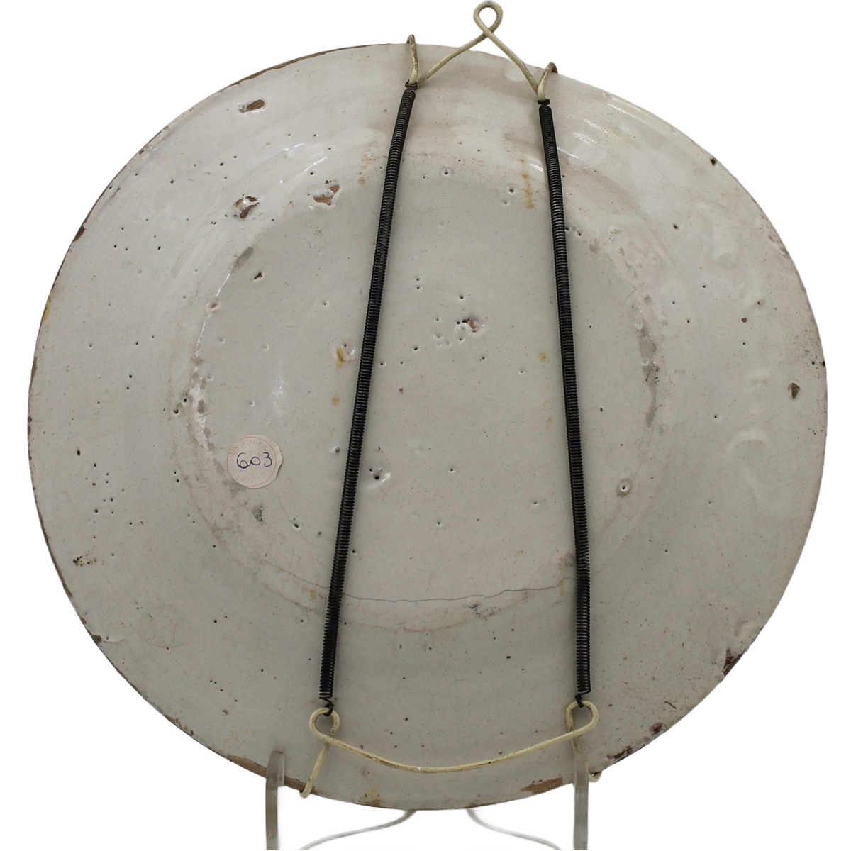 € 150Antica maiolica con decoro centrale raffigurante paesaggio con casolari e motivi ornamentali policromi a contorno. Italia centrale. Inizi secolo XIX. Cm d 27,5