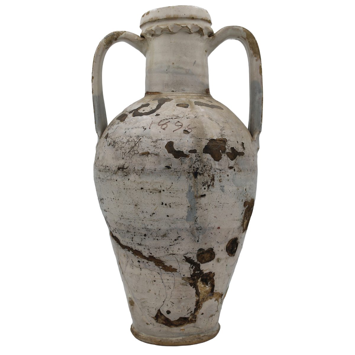 € 150Antica maiolica con decoro a motivi floreali e vegetali policromi su fondo crema (varie mancanze sul retro). Caltagirone. Datata 1898. Cm h 62
