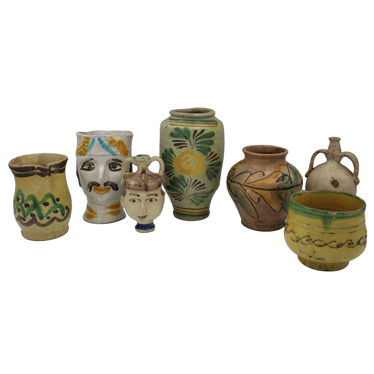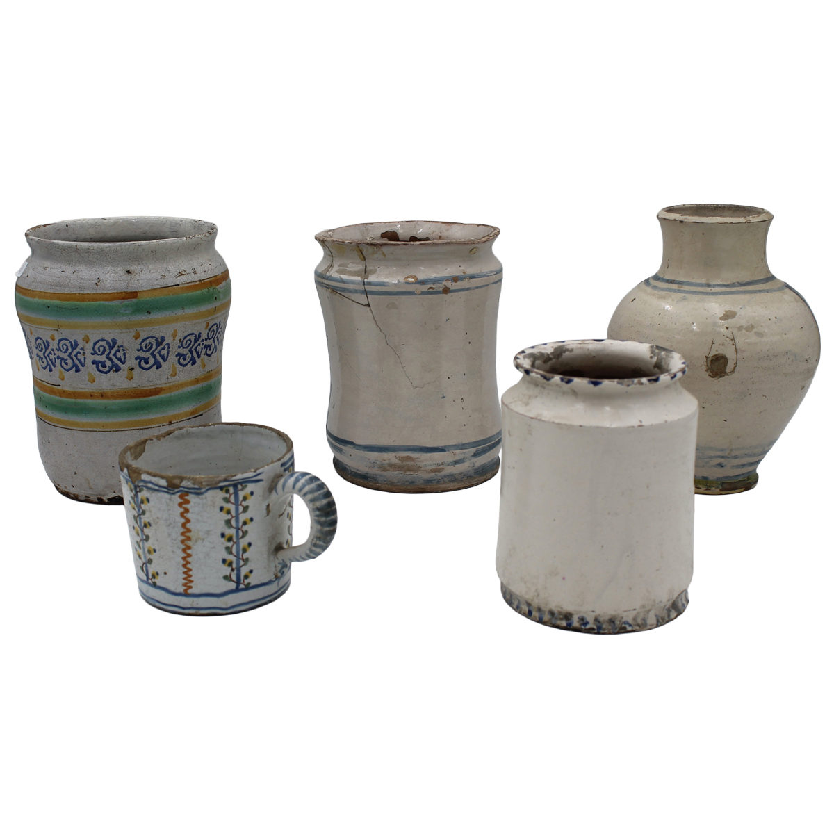 € 250Antica maiolica di diversa fattura con decoro a motivi ornamentali policromi. Lotto composto da tre cilindri, una boccia e un piccolo contenitore (failure e rotture in uno dei cilindri). Italia meridionale. Inizi del secolo XIX. Cm h 23,5 (la maggiore)