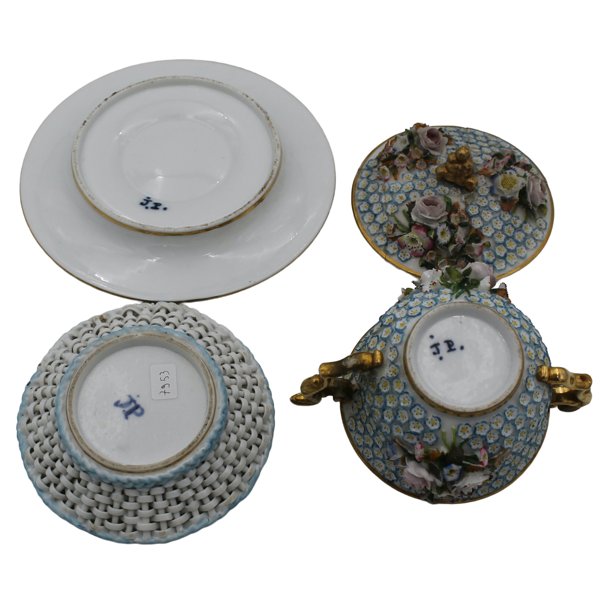 € 100Porcellana con ricco decoro a motivi floreali a rilievo e ornamenti in oro (rotture al coperchio della tazza e piccole mancanze). Francia. Marcato Jacob Petit. Fine secolo XIX. Cm h 11