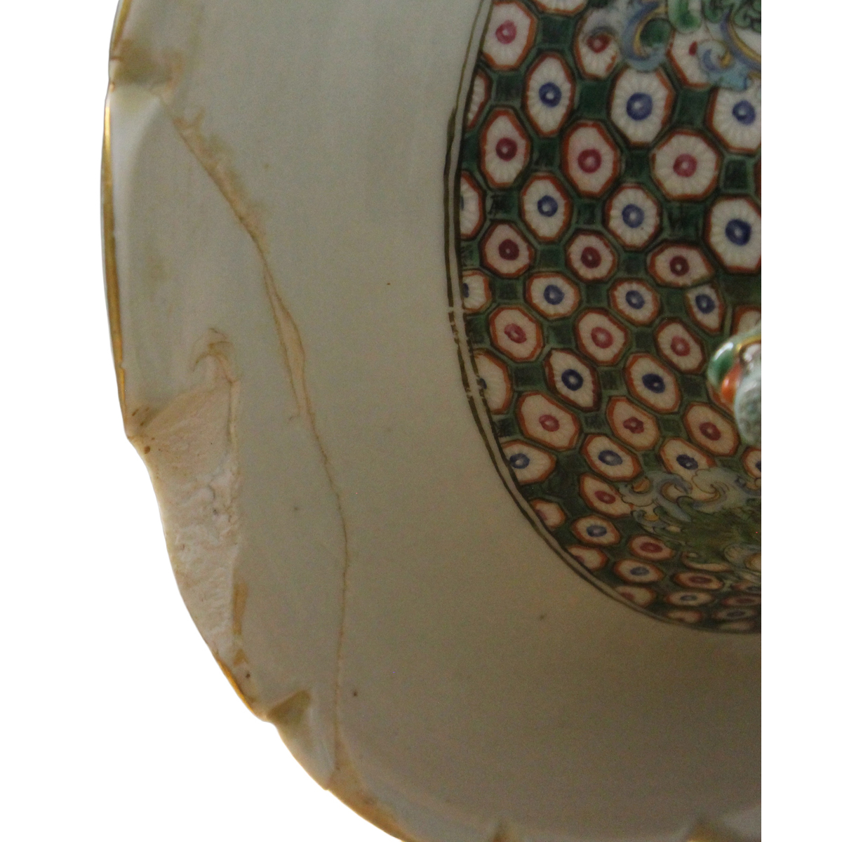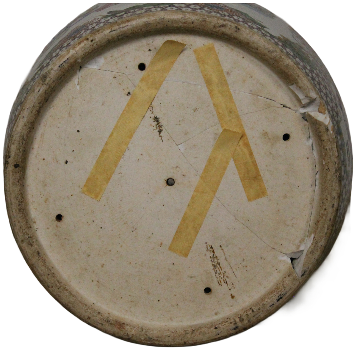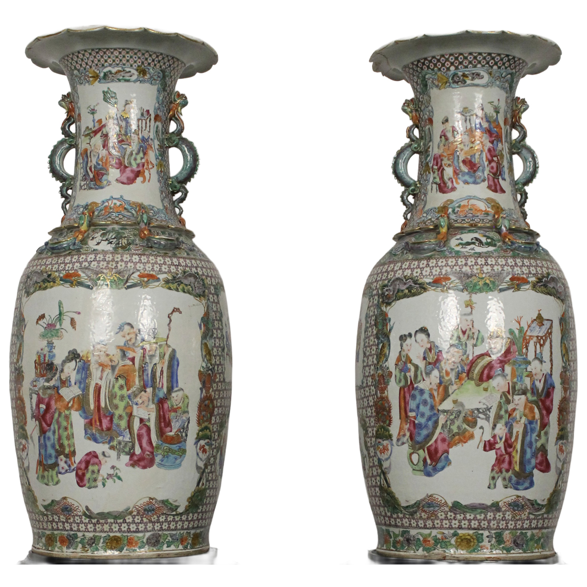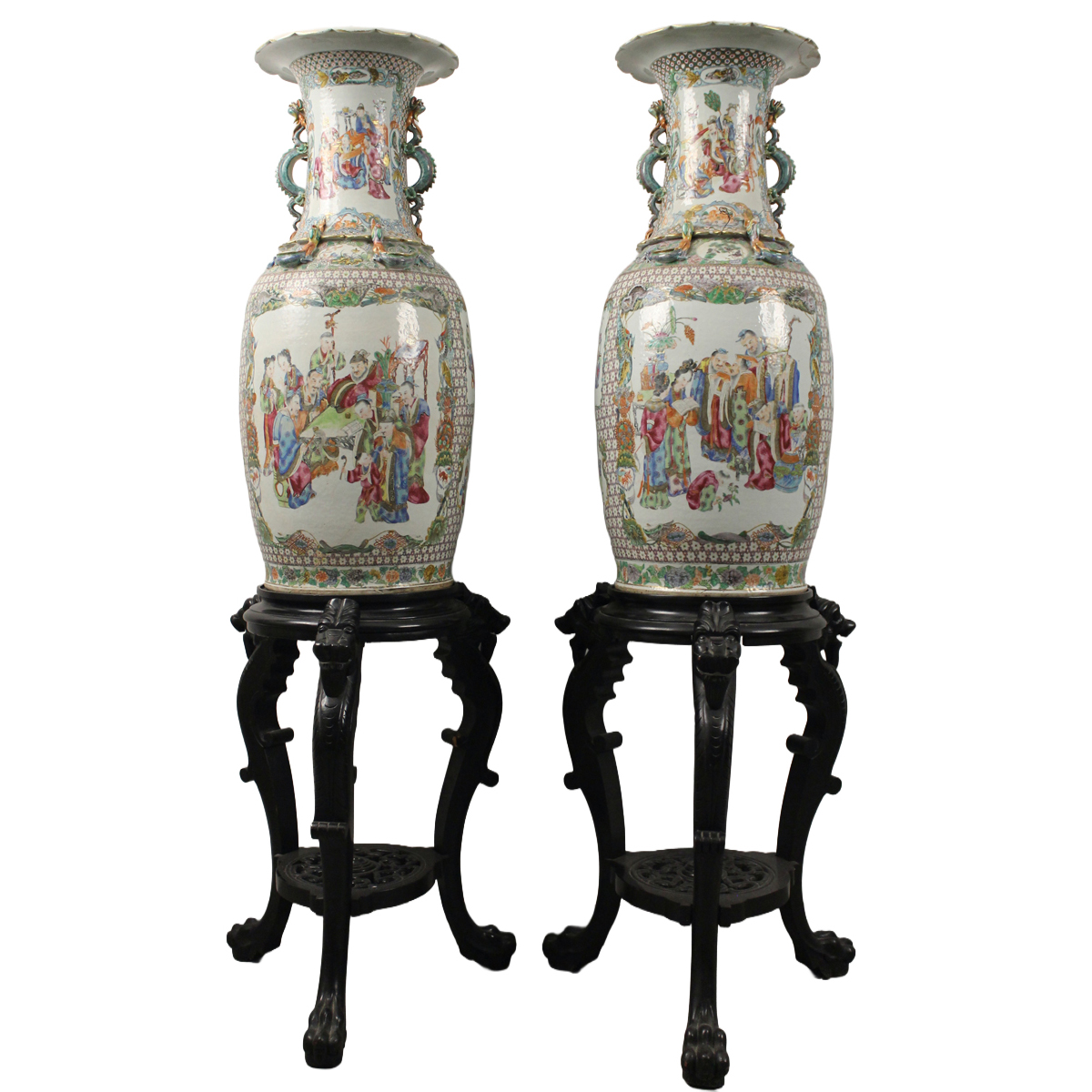 € 1.000Porcellana riccamente decorata con scene orientali, motivi vegetali e floreali (rotture in entrambi i vasi). Basi in legno ebanizzato con figure di draghi scolpiti. Cina. Fine secolo XIX. Cm h 90 (vasi); cm h 70, cm d 46 (basi)