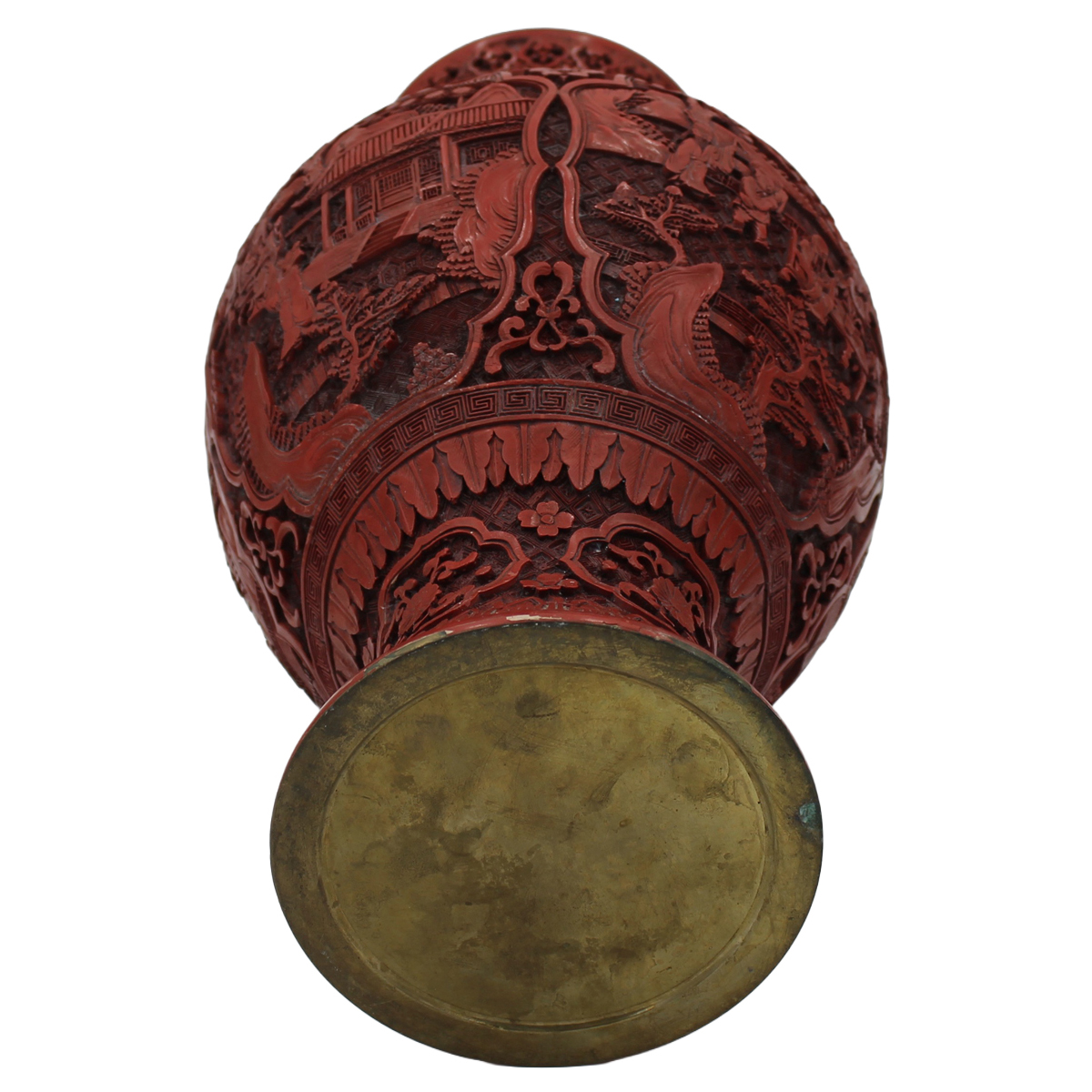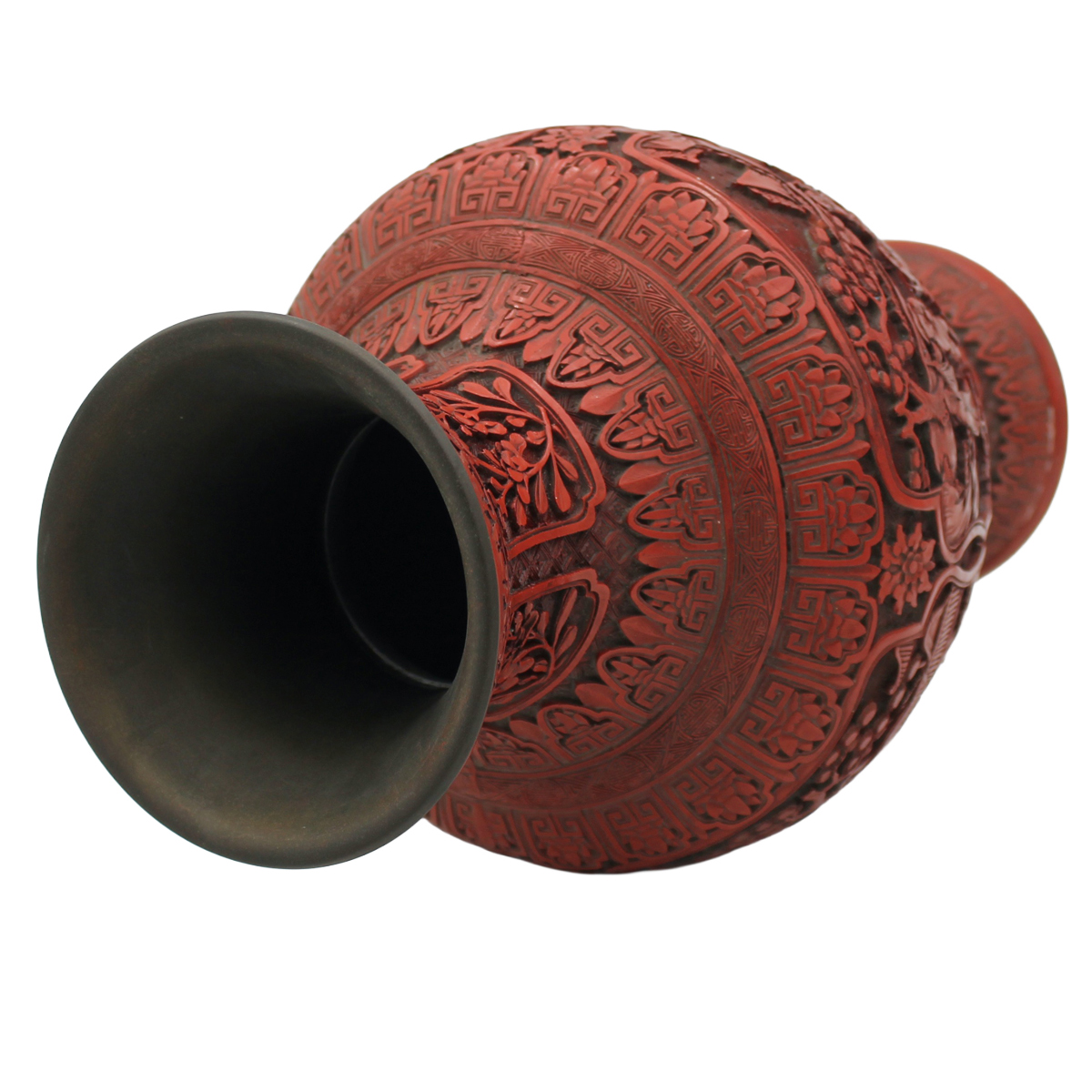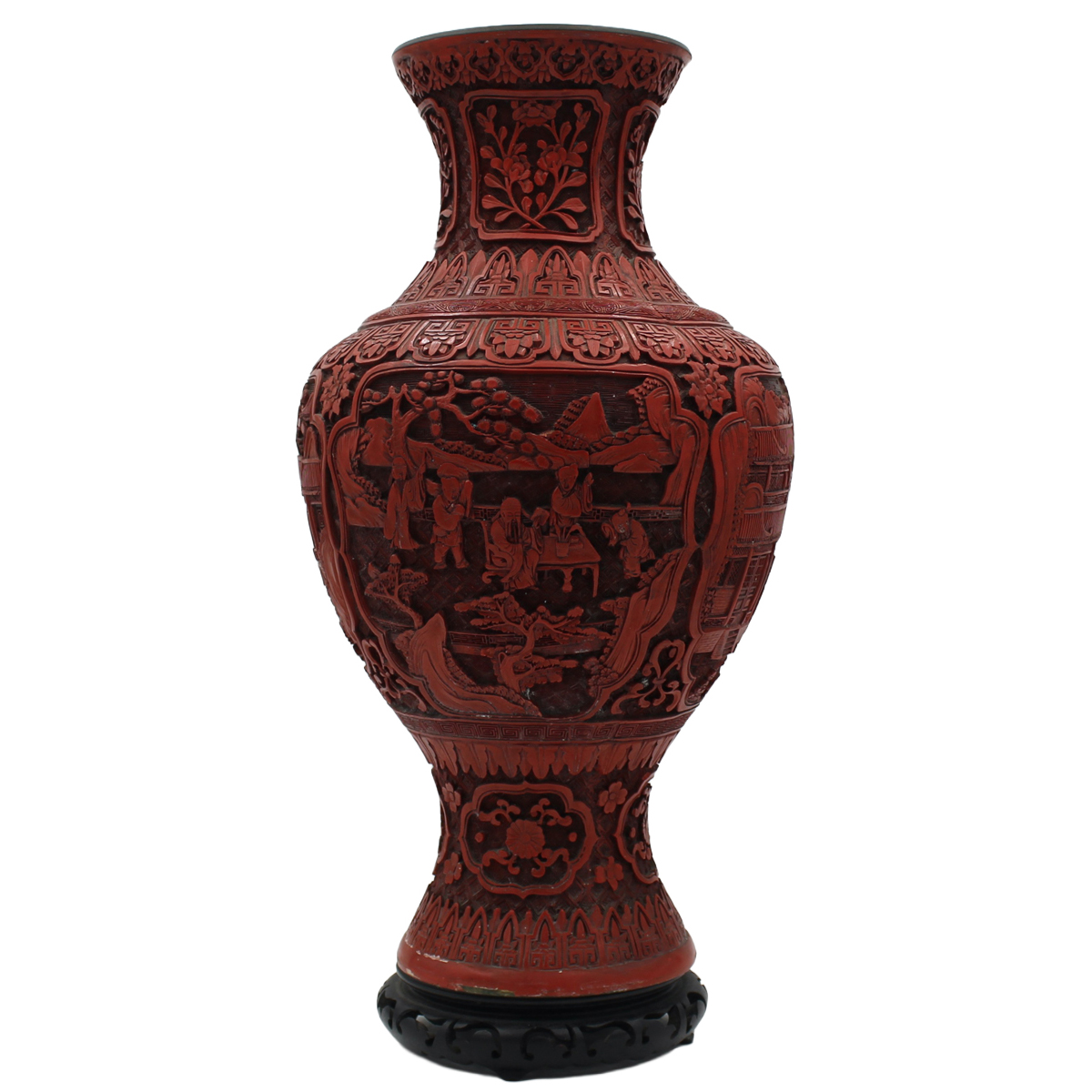 € 700Lacca rossa a rilievo con decoro orientale a motivi vegetali e floreali. Cina. Periodo Qialong. Fine secolo XIX. Cm h 47