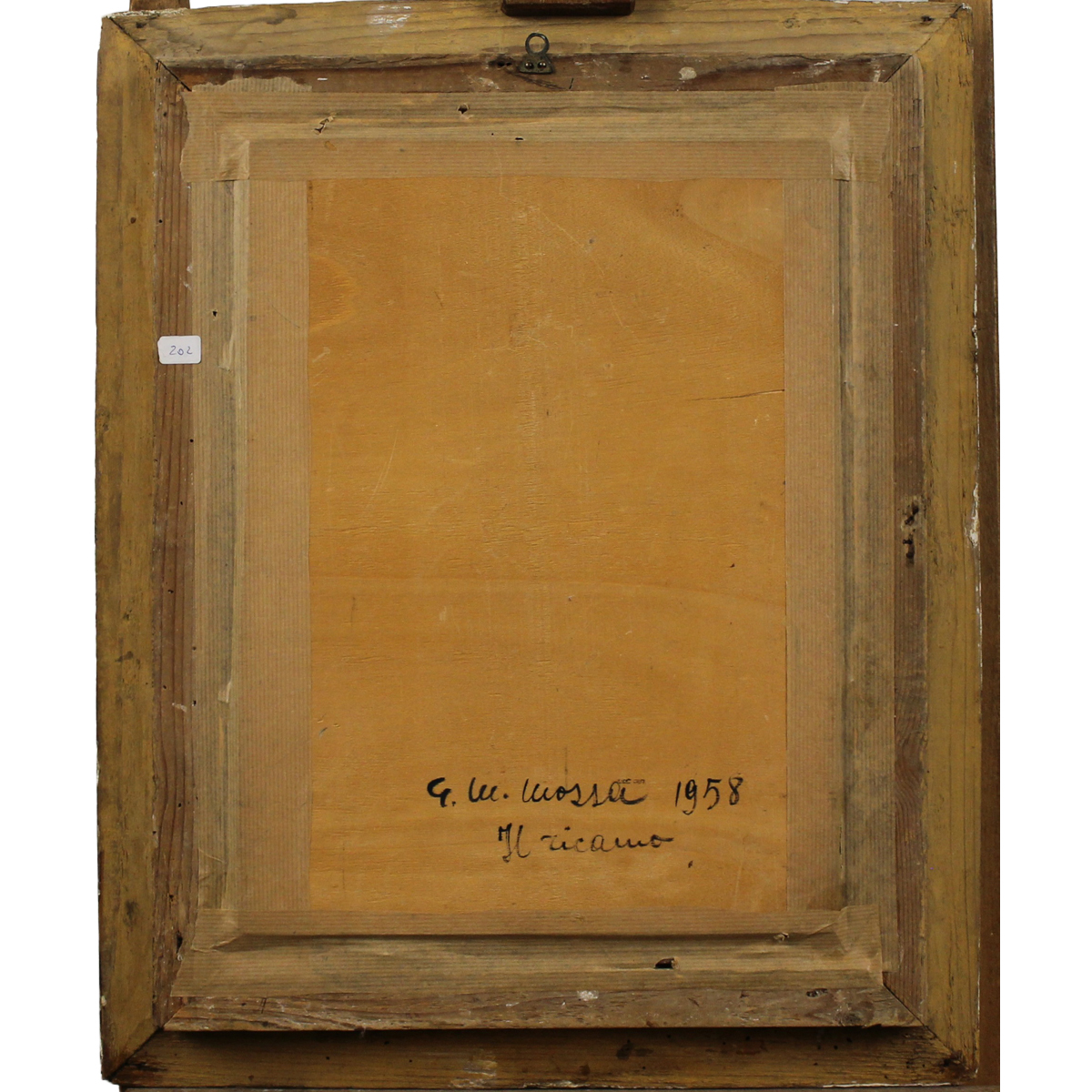 € 300Dipinto ad olio su tavola in cornice in legno dorato a vassoio. Datato 1958. Cm 40x30