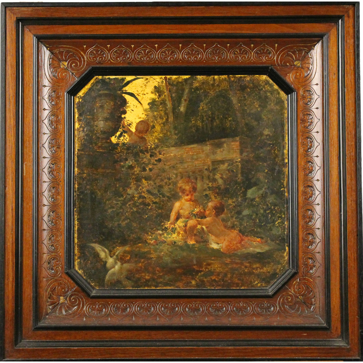 € 400Dipinto ad olio su tavola in cornice in legno intagliato a motivi vegetali. Cm d 28
