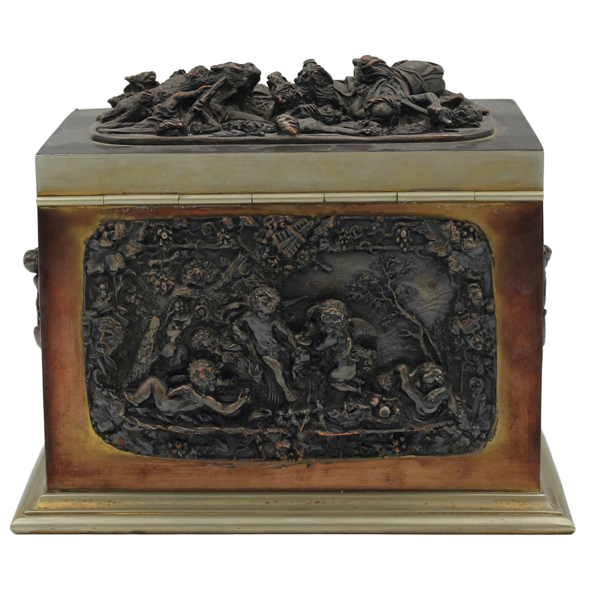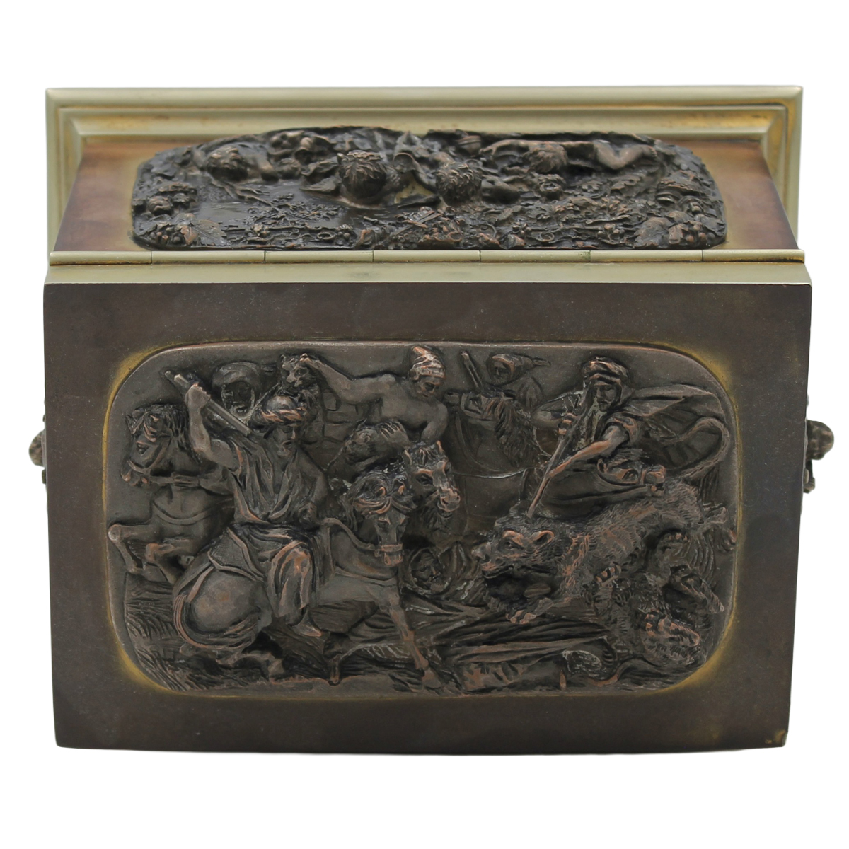 € 100Ottone e bronzo con scene classiche a rilievo. Fine secolo XIX. Cm 18x13 h 13