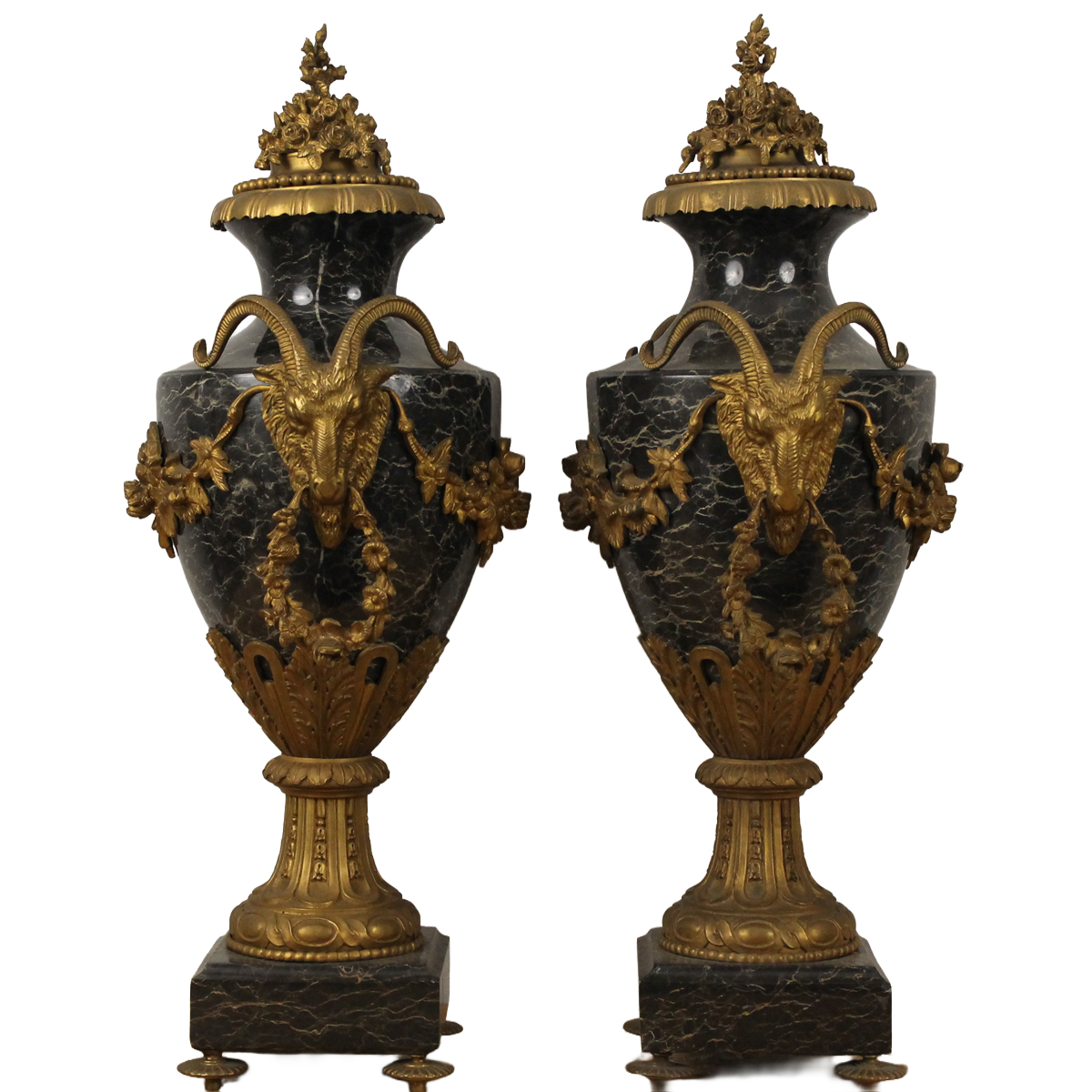 € 2.200Marmo venato con ricca applicazione di bronzi dorati decorati a motivi vegetali e sui laterali con teste di caproni. Francia. Inizi secolo XX. Cm h80
