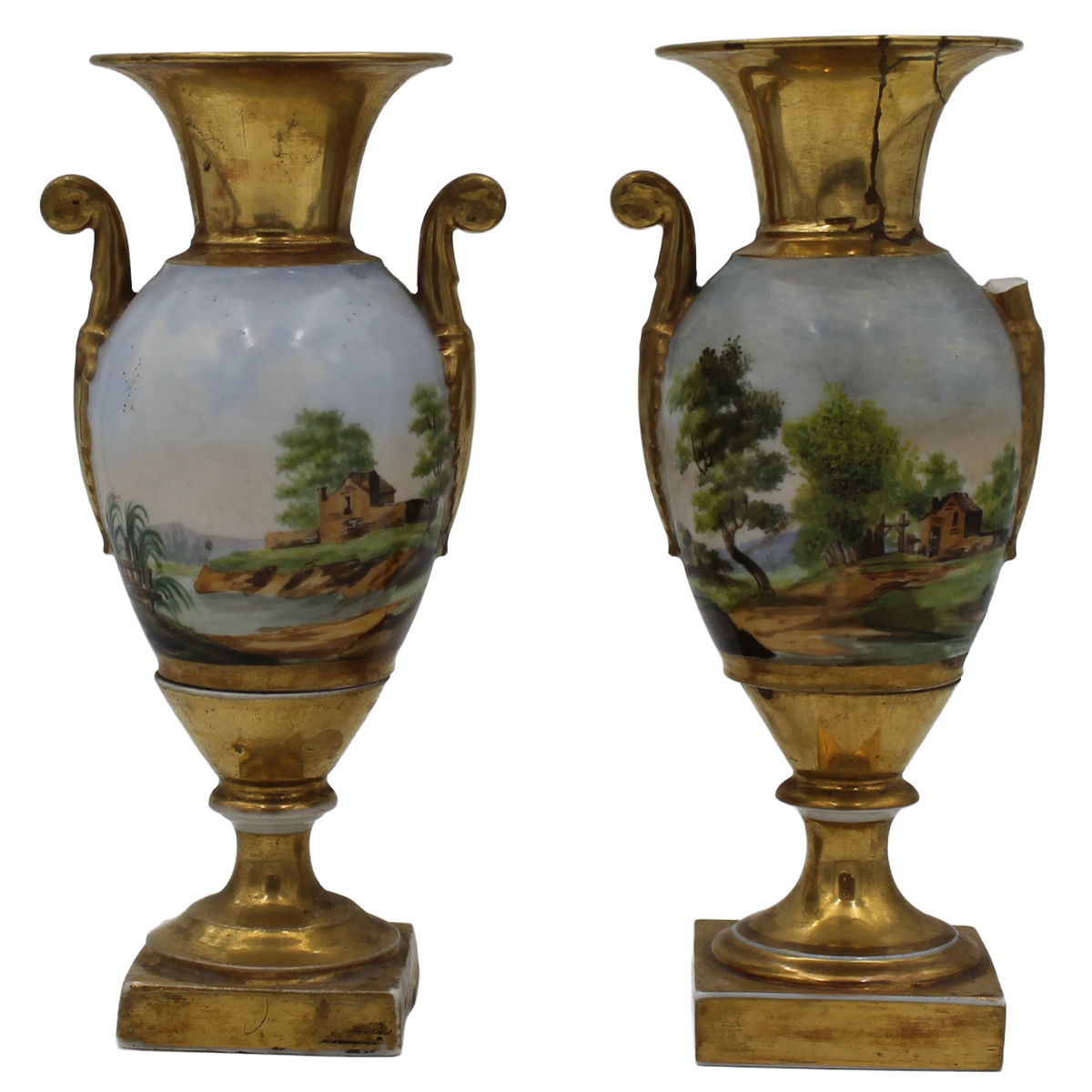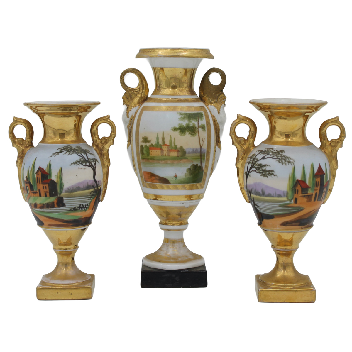 € 150Antica porcellana decorata con paesaggi con casolari e ornamenti in oro (piccola sbeccatura sul vaso più alto). Francia. Epoca Impero. Cm h 24,5 (il maggiore)