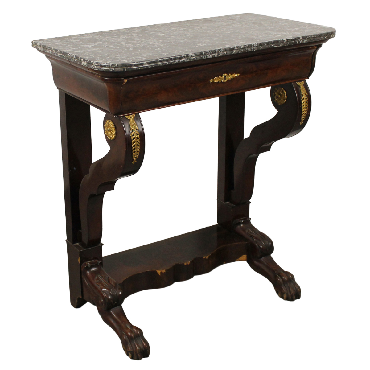 € 200Mogano con applicazioni di bronzi dorati. Piano in marmo nero. Francia. Secolo XIX. Cm d 100; cm h 77