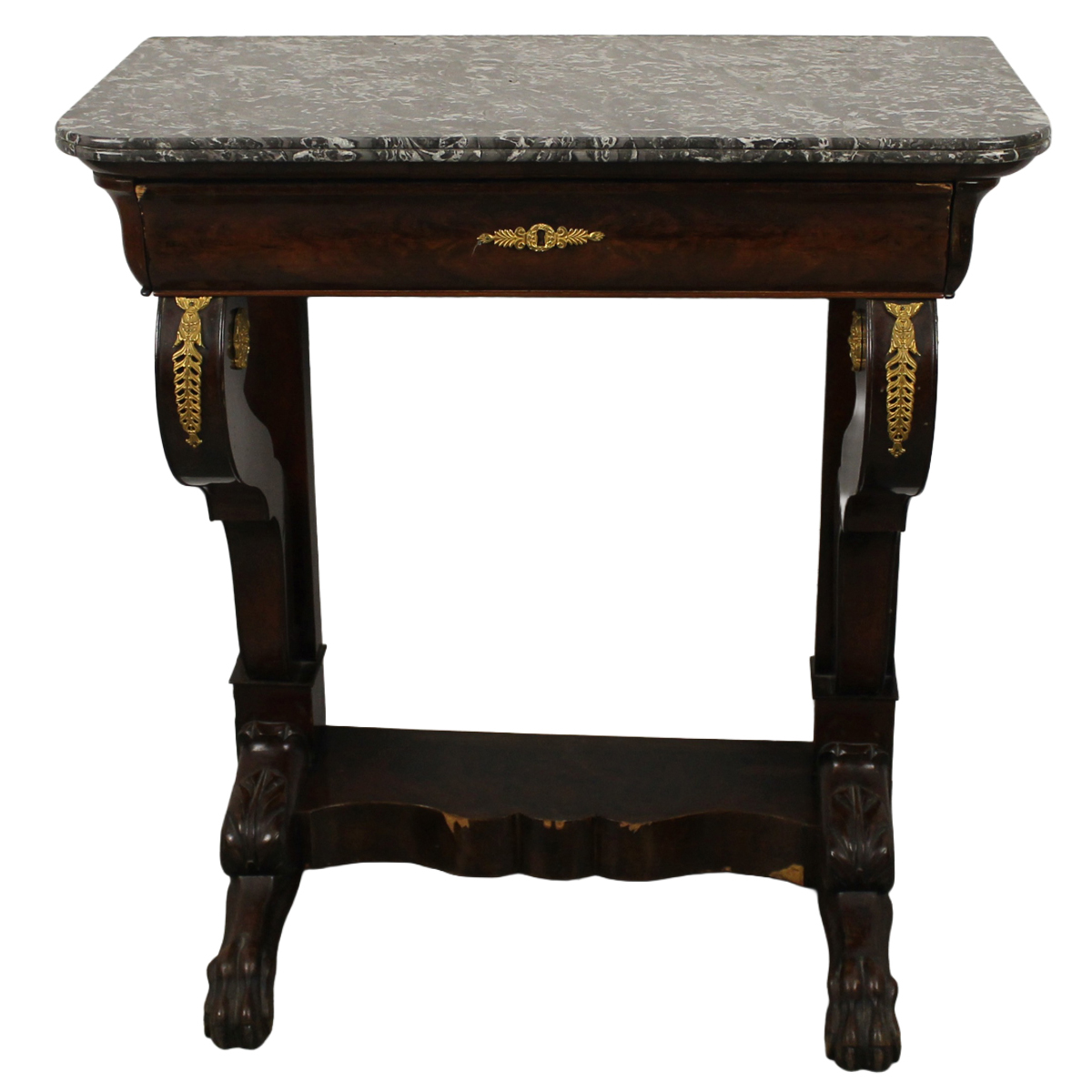 € 200Piuma di mogano con applicazioni di bronzi dorati e piedi leonini scolpiti. Piano in marmo grigio. Francia. Epoca Napoleone III. Cm 80x43 h 87