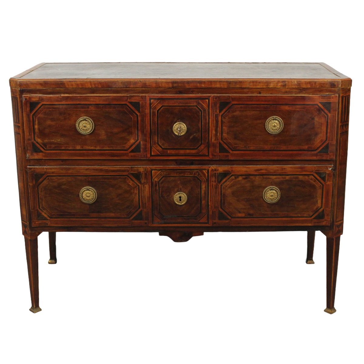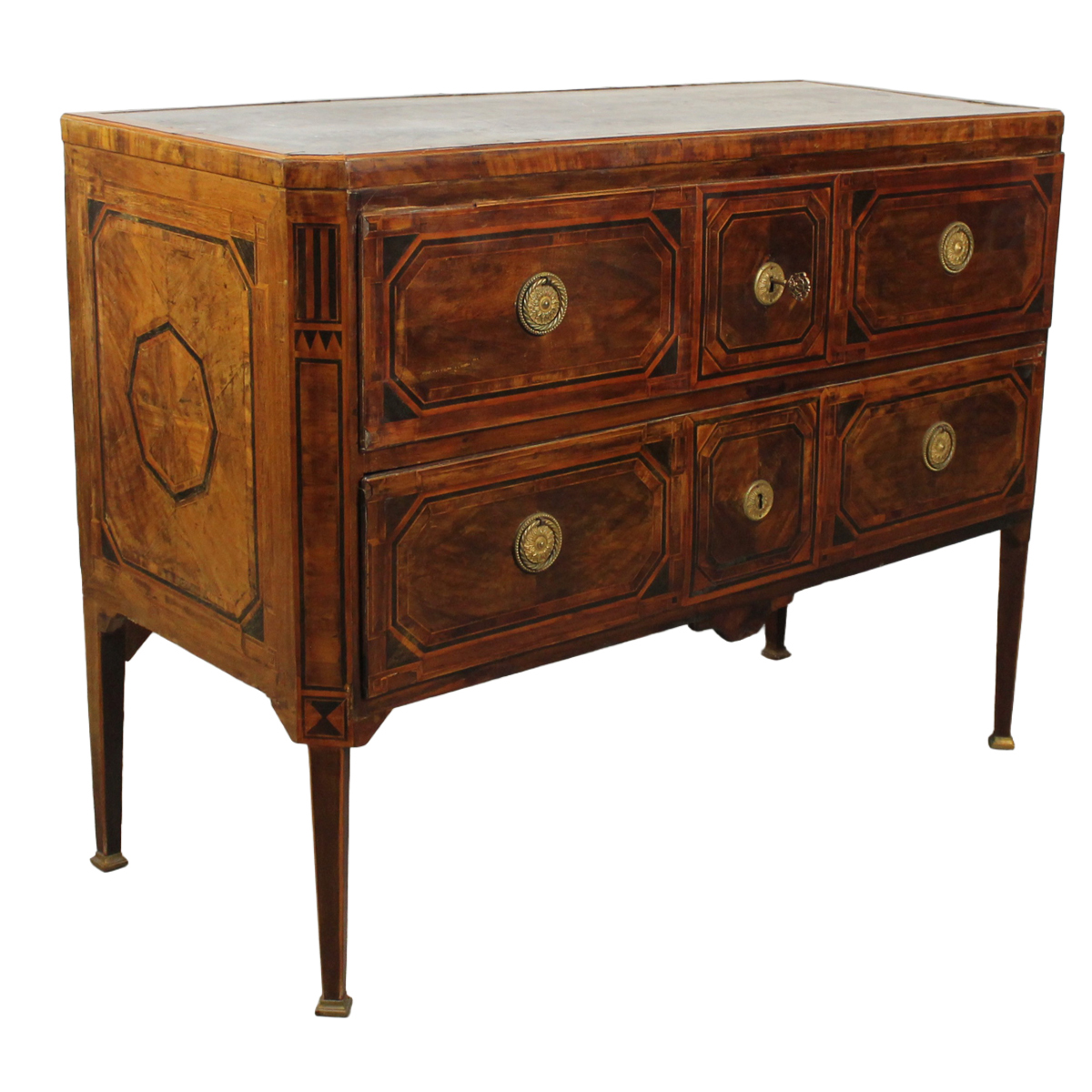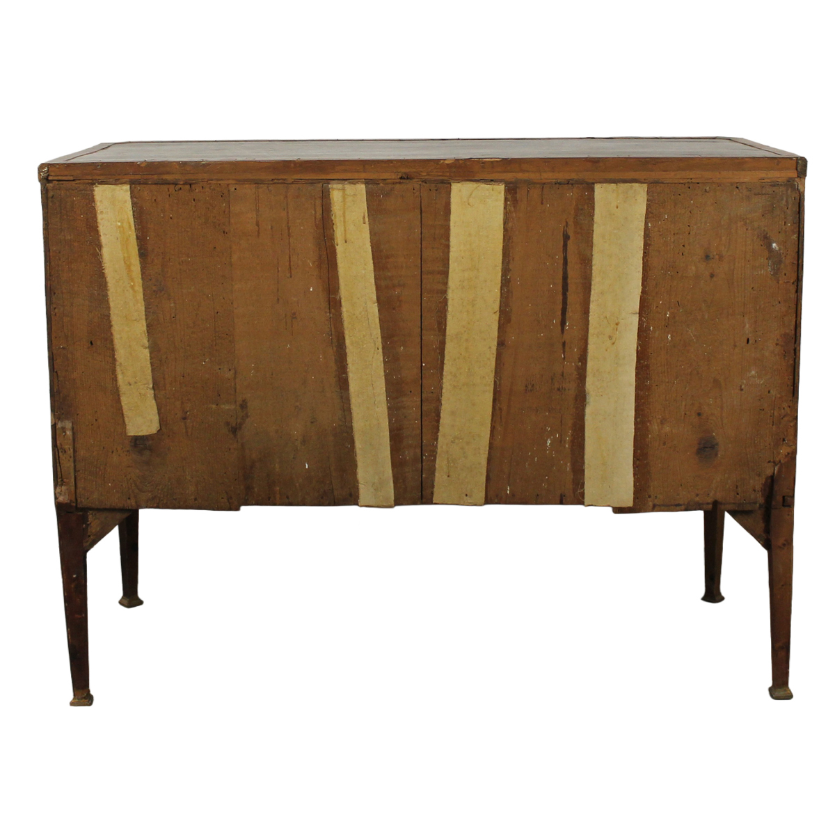 € 2.500Noce e palissandro con perfili in bosso a motivi geometrici e piano in marmo grigio incassato (rottura su uno dei due marmi). Sicilia. Epoca Luigi XVI. Cm 126x54 h 95