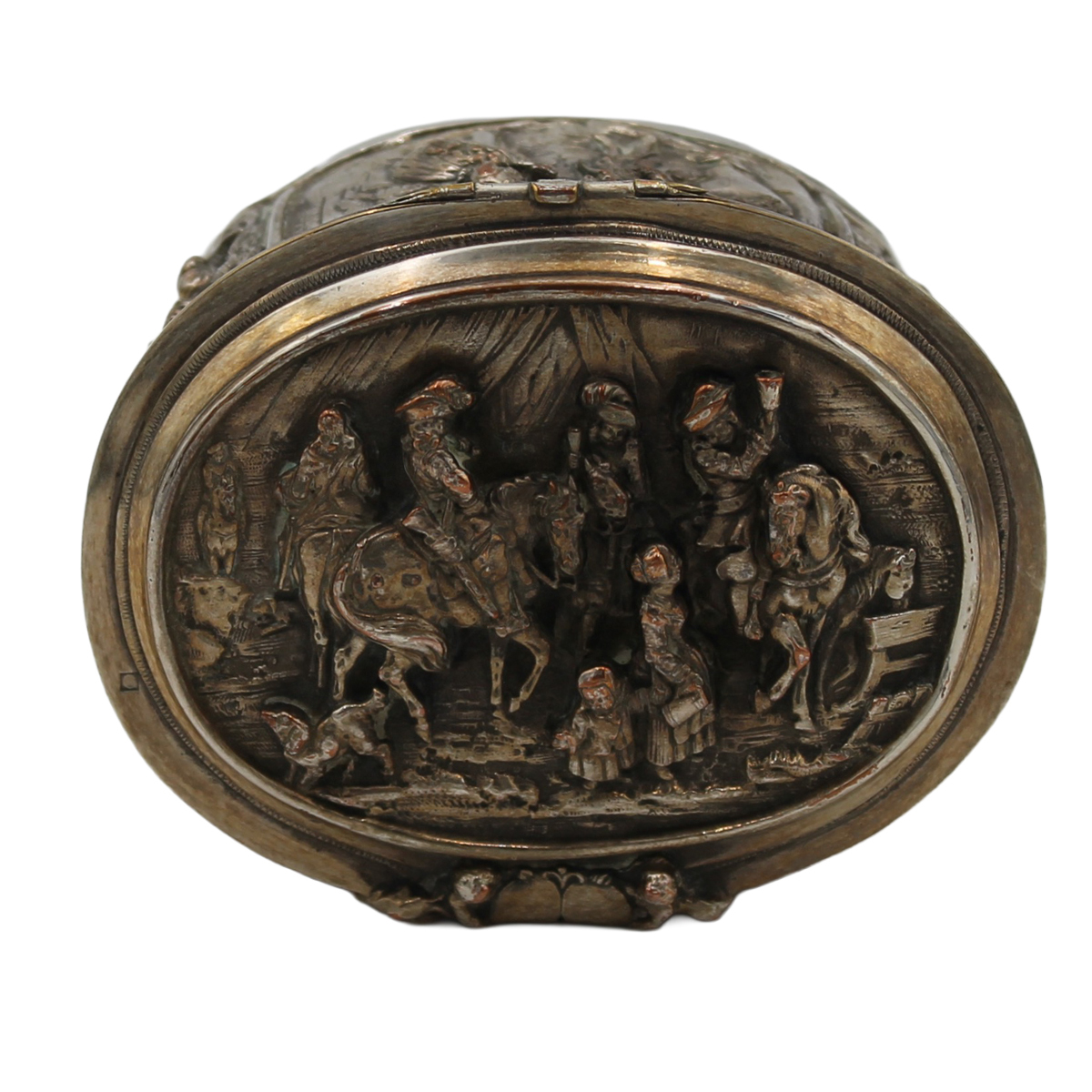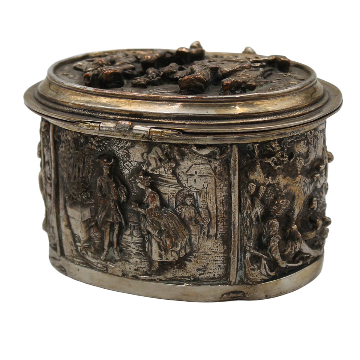 € 80Argento sbalzato e decorato con scene galanti a rilievo a tutto tondo e sul piano. Francia. Secolo XIX. Peso 246,80 gr. Cm 10x9 h 6