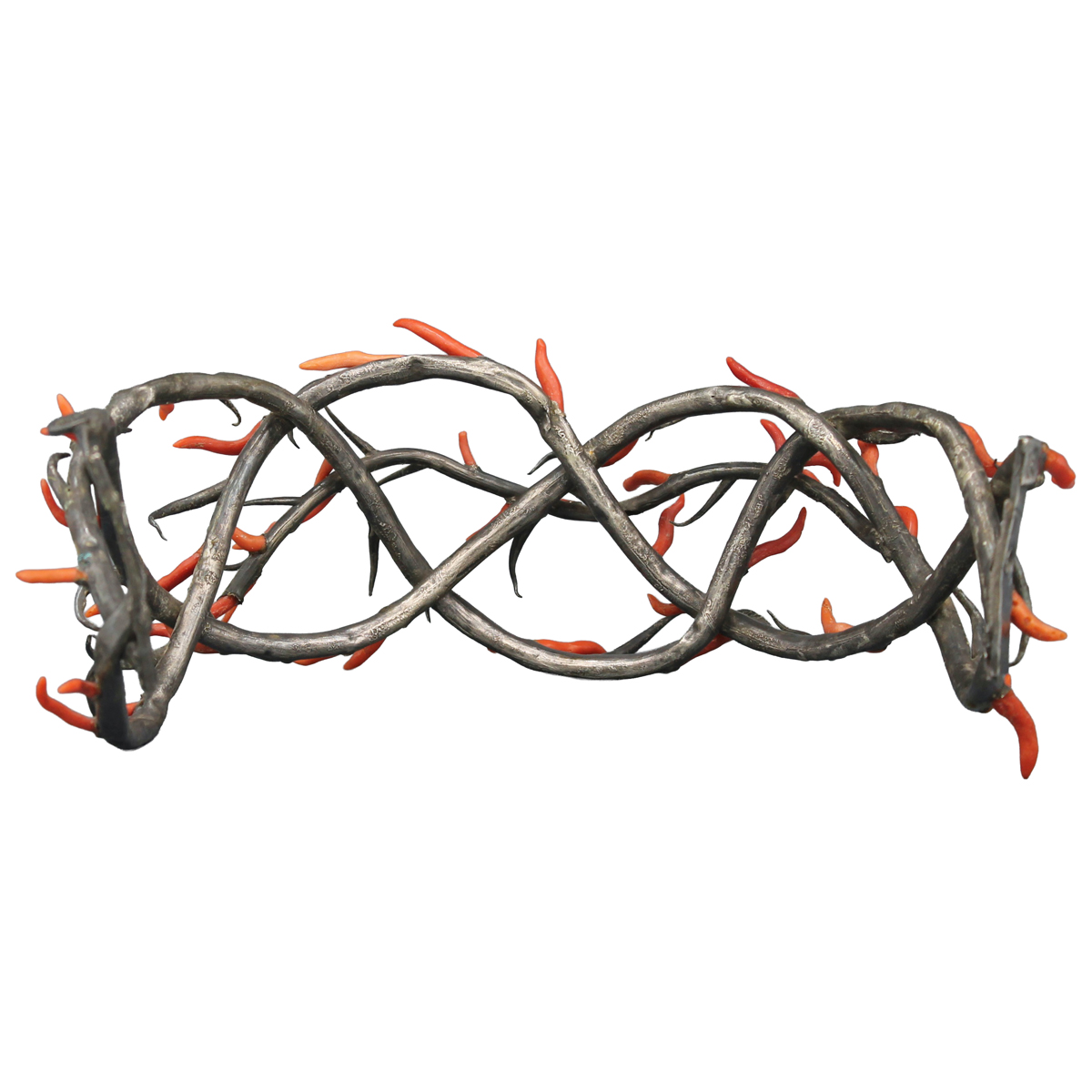 € 1.000Argento inciso e sbalzato con applicazioni di corallo trapanese. Bollata Palermo. Secolo XVIII. Cm larghezza 22