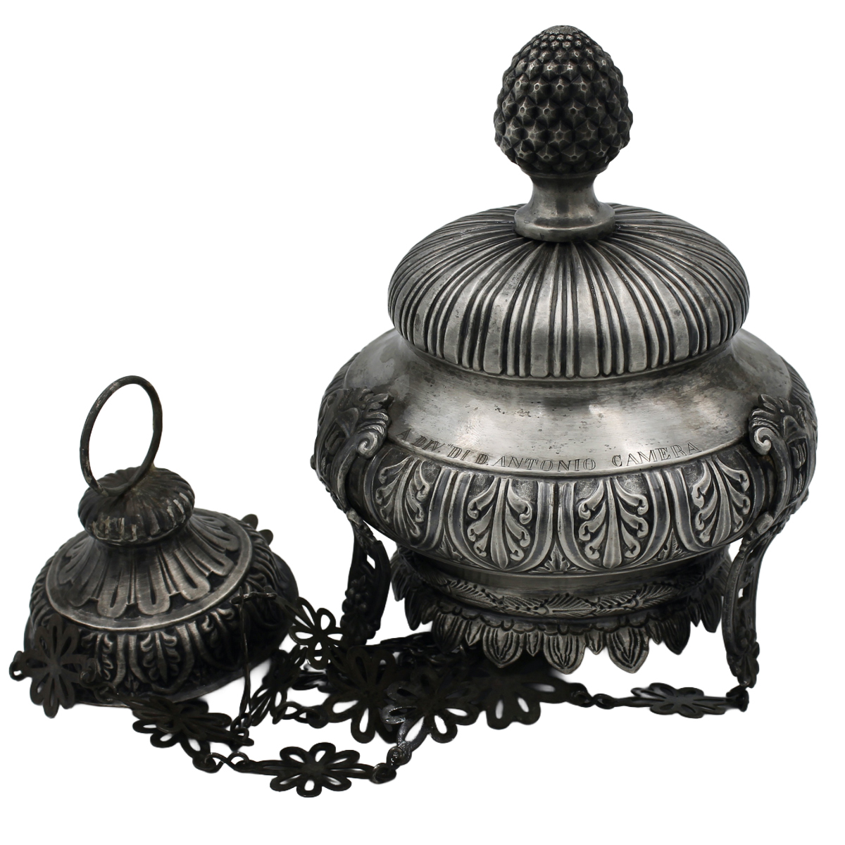 € 1.800Antico argento inciso e sbalzato. Iscrizioni e bolli. Secolo XIX. Peso gr. 1.500 (complessivo). Cm h 67 (inclusa catena)