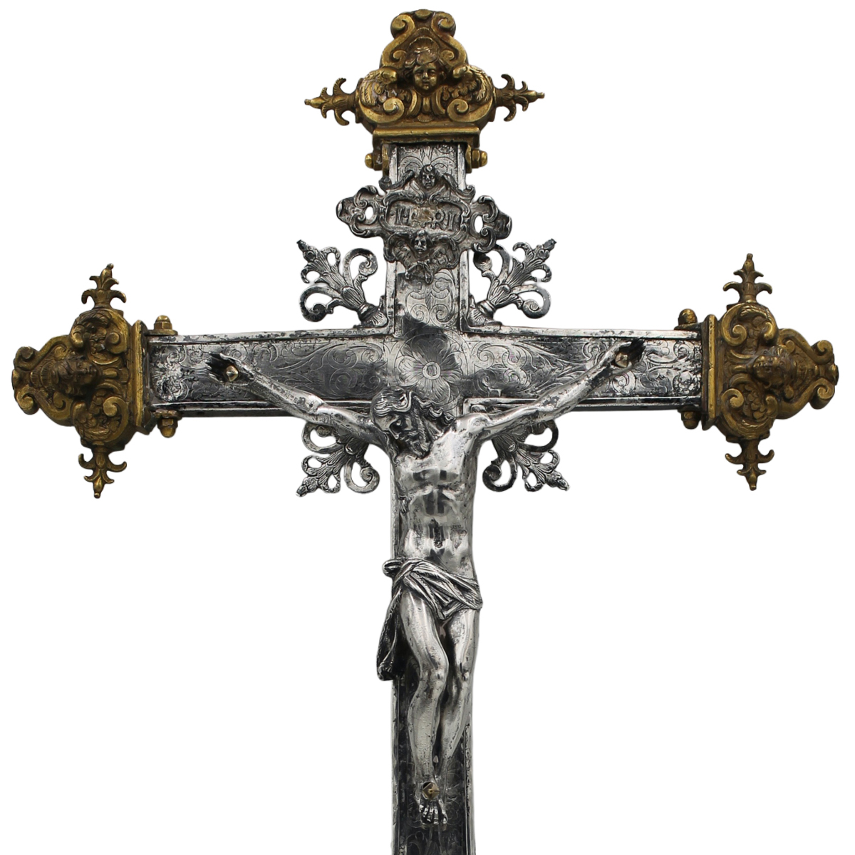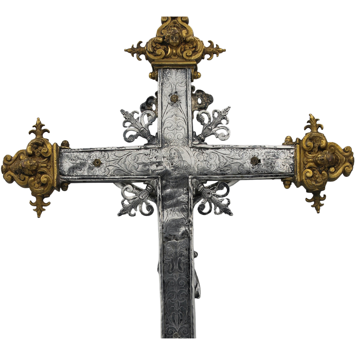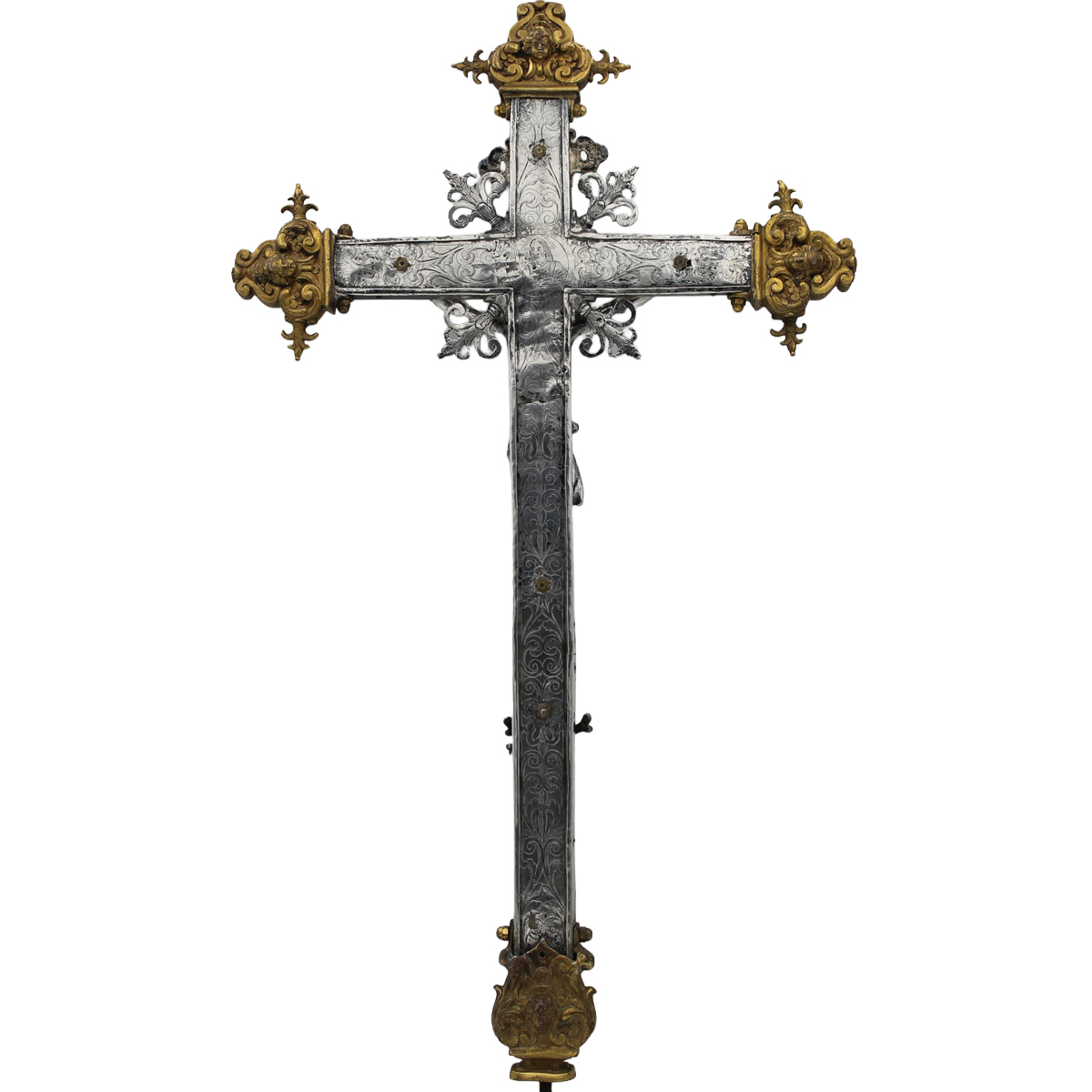 € 2.000Antica argento finemente inciso e sbalzato con puntali in bronzo dorato e figura del Cristo finemente cesellata. Sicilia. Fine secolo XVI. Cm 63x36 (croce); cm 22x20