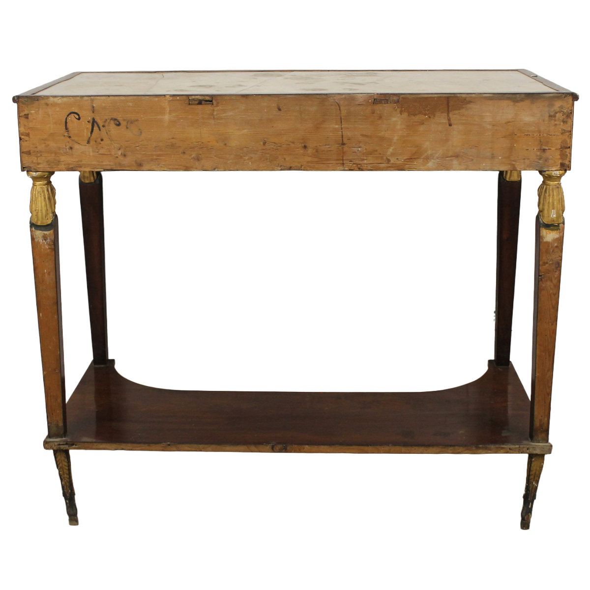 € 400Mogano con figure egizie scolpite e dorate sui laterali e applicazioni di bronzi dorati (lievi danni ai piedi). Piano in marmo bianco incassato (danni). Sicilia. Inizi del secolo XIX. Cm 115,5x55 h 100