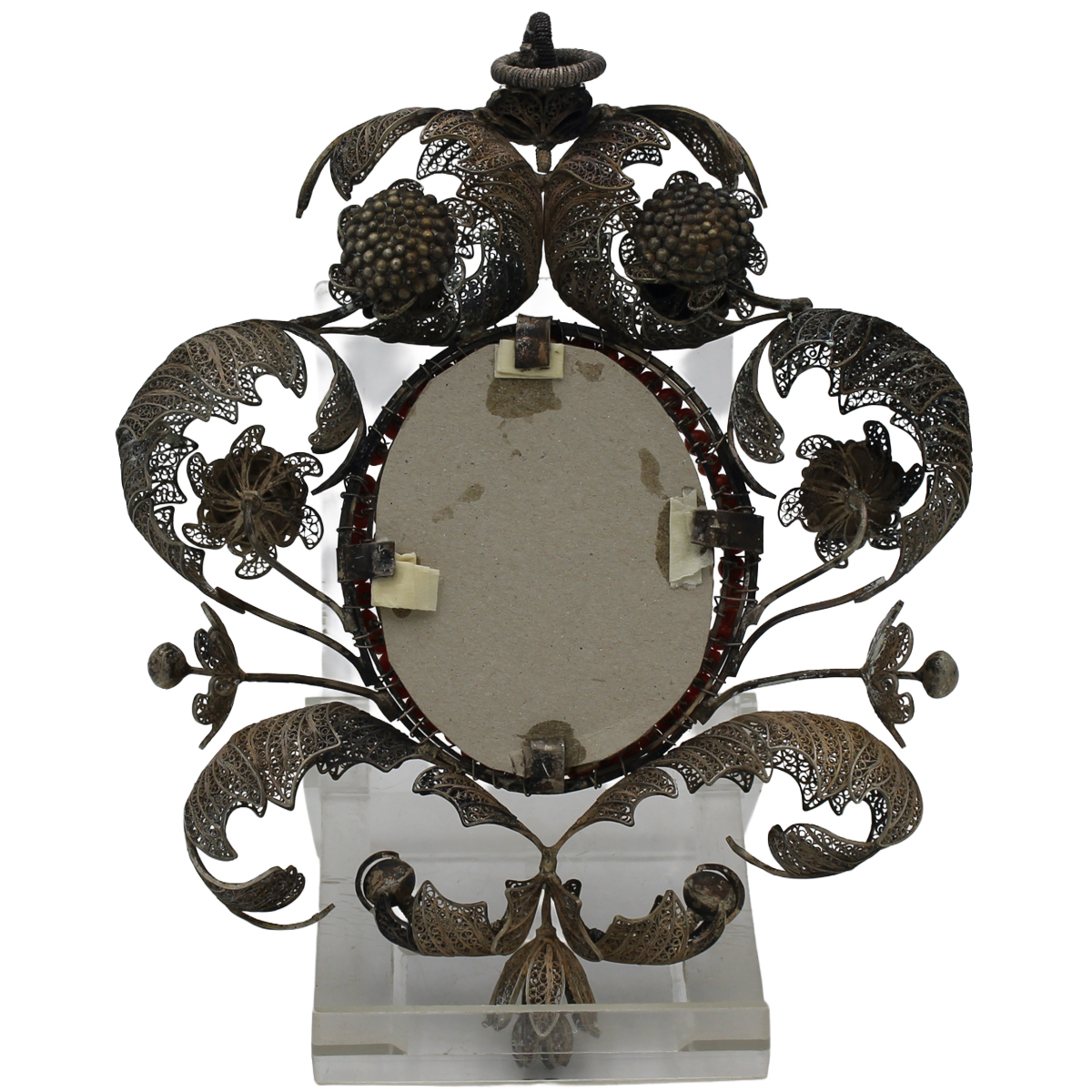 € 2.500Dipinto ad olio con elegante cornice in filigrana d'argento e applicazioni di perle in corallo. Cm 10x7,5 (pittura); cm 24x20 (cornice)