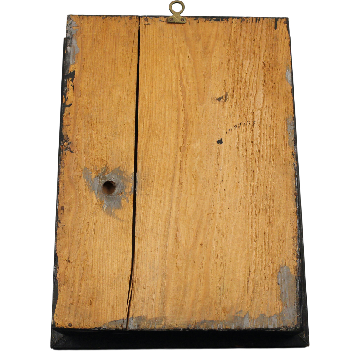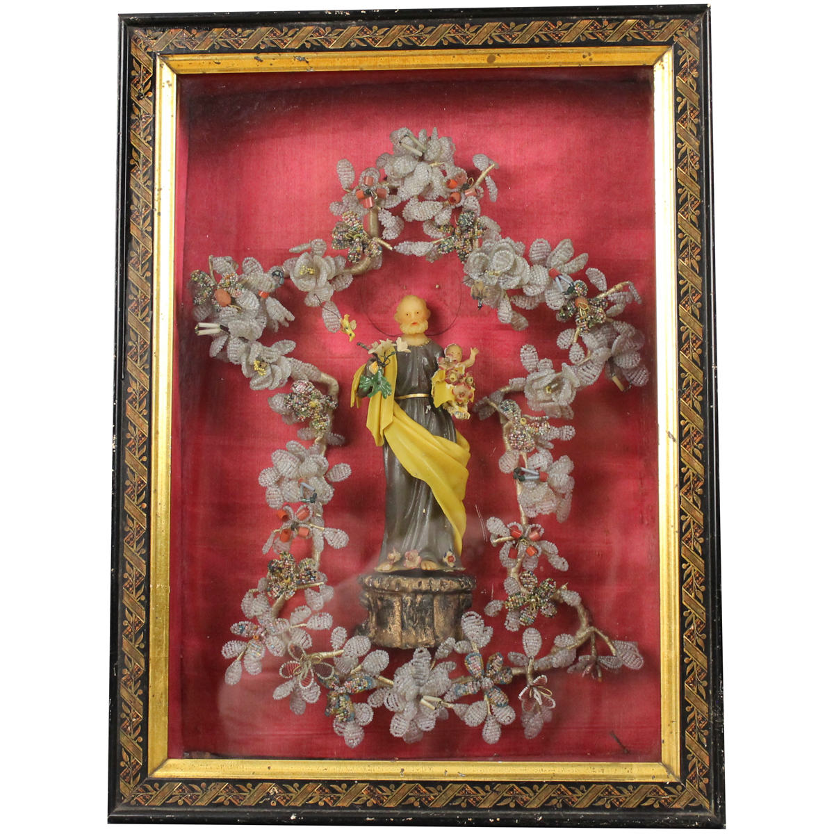 € 700Piccola statua in cera policroma contornata da ghirlanda in stoffe ricamate e applicazioni in corallo. Teca in legno ebanizzato. Cm 39x29x9 (teca)
