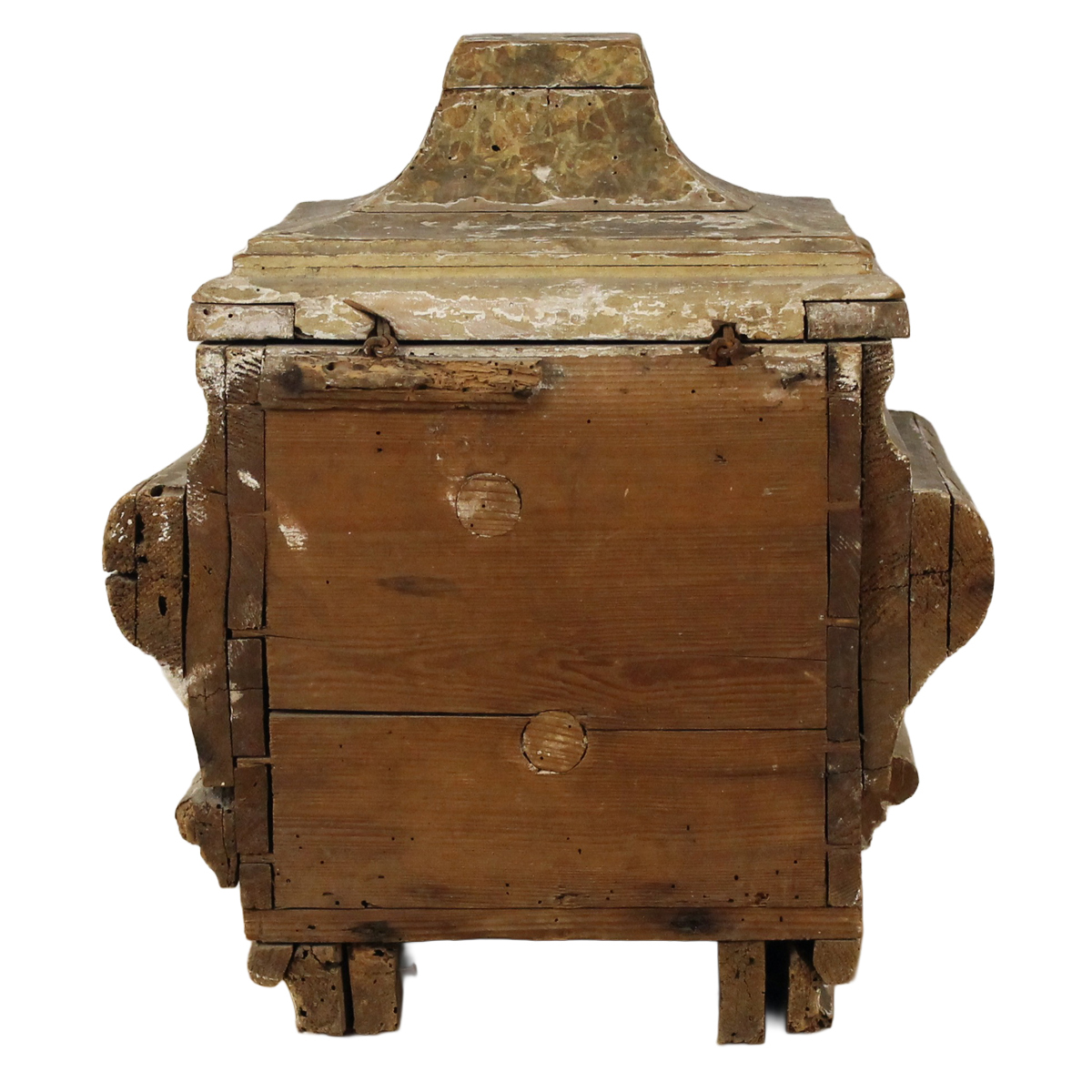 € 200Legno laccato a finto marmo (gravi segni di usura e mancanze). Sicilia. Secolo XVIII. Cm 37x33 h 45