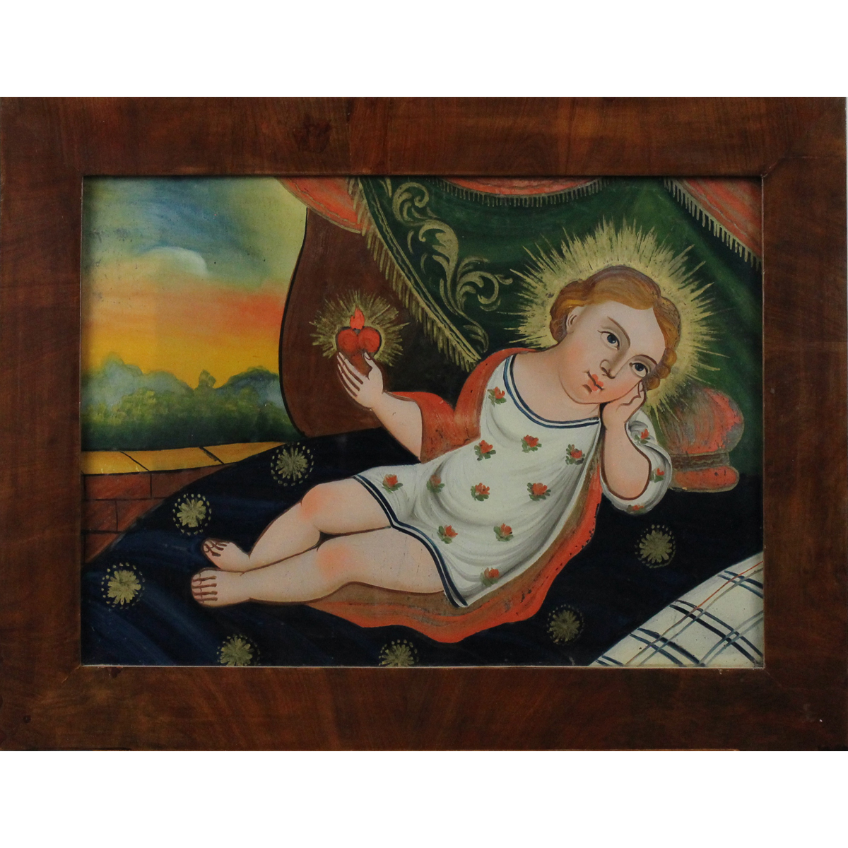 € 500Coppia di dipinti ad olio su vetro in cornice in legno dorato. Cm 35x43