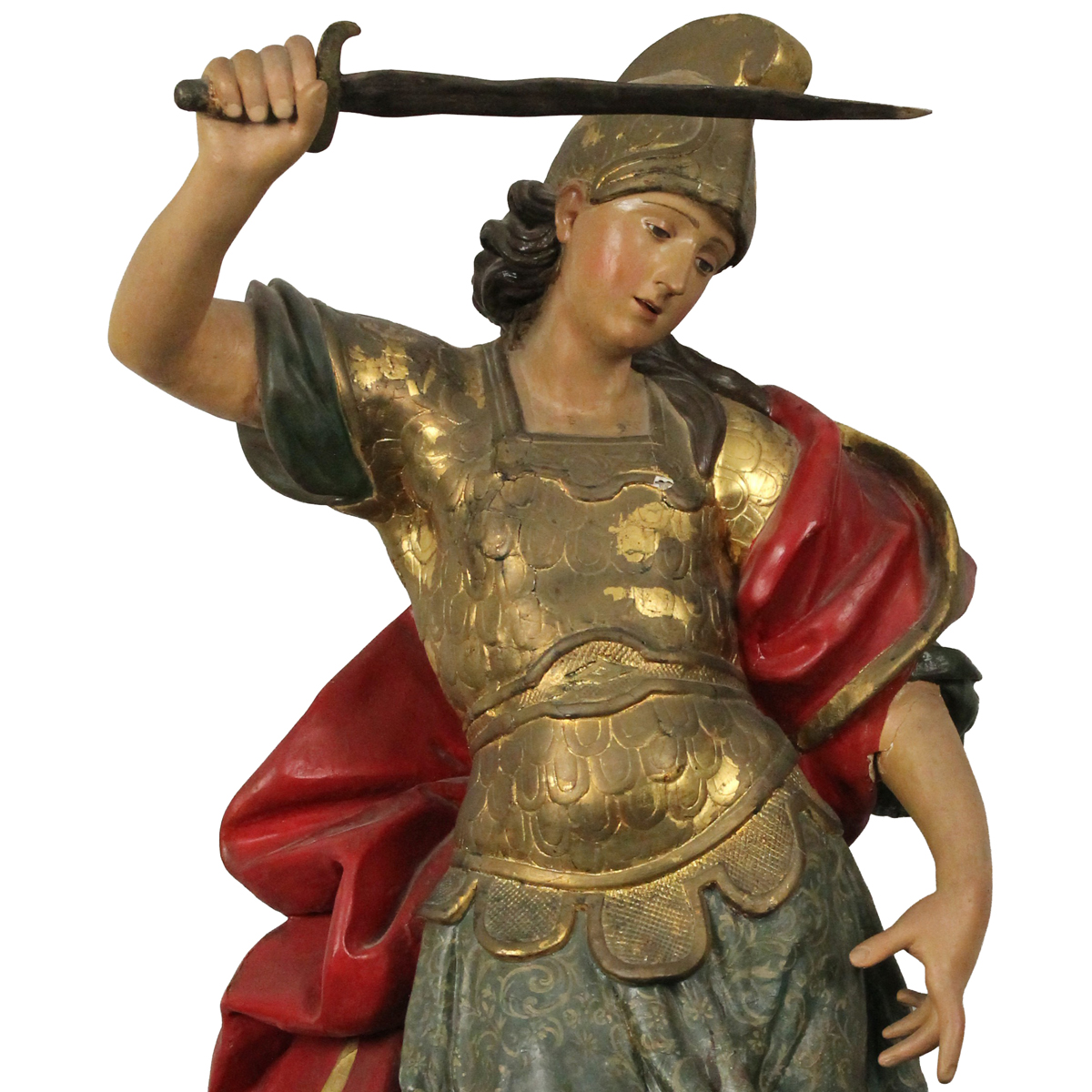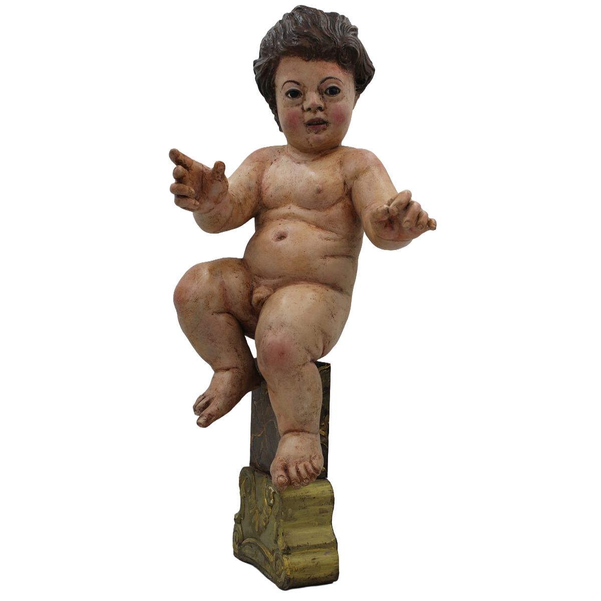 € 1.000Grande scultura in legno scolpito, dorato e dipinto (mancanze e restauri). Base in legno di epoca posteriore. Cm h 123 (esclusa base)