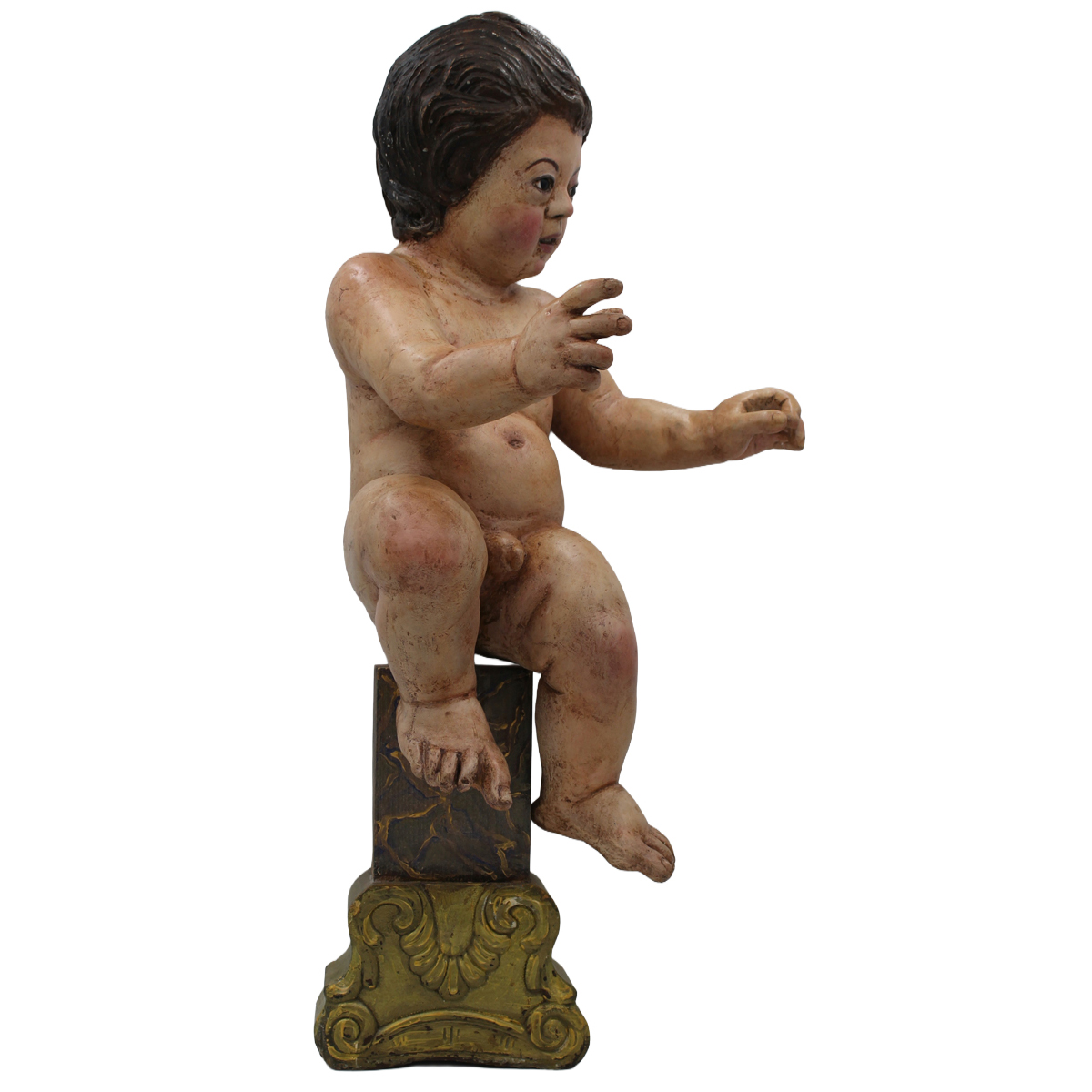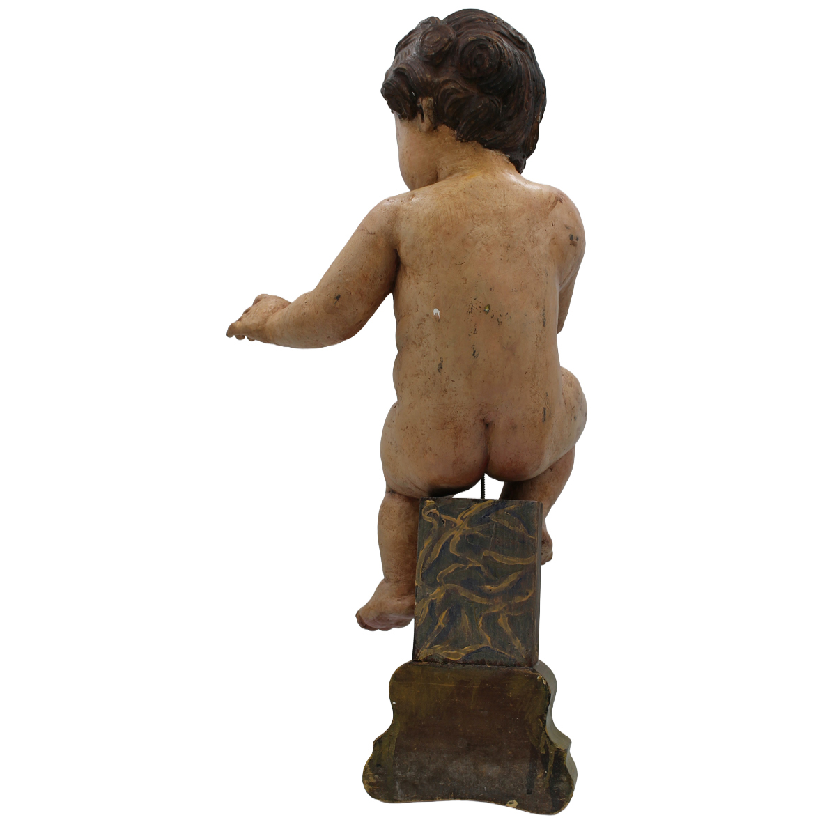 € 500Legno scolpito e dipinto con base in legno dorato (restauri e base di epoca posteriore). Sicilia. Fine del secolo XVIII. Cm h 62 (putto), cm h 72 (con base)