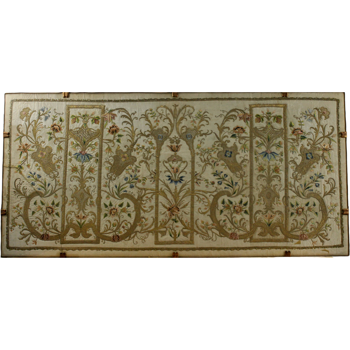 € 120Legno dorato e scolpito. Arazzo con decoro a filo d'oro a motivi vegetali (danni). Sicilia. Inizi secolo XIX. Cm 115,5x70