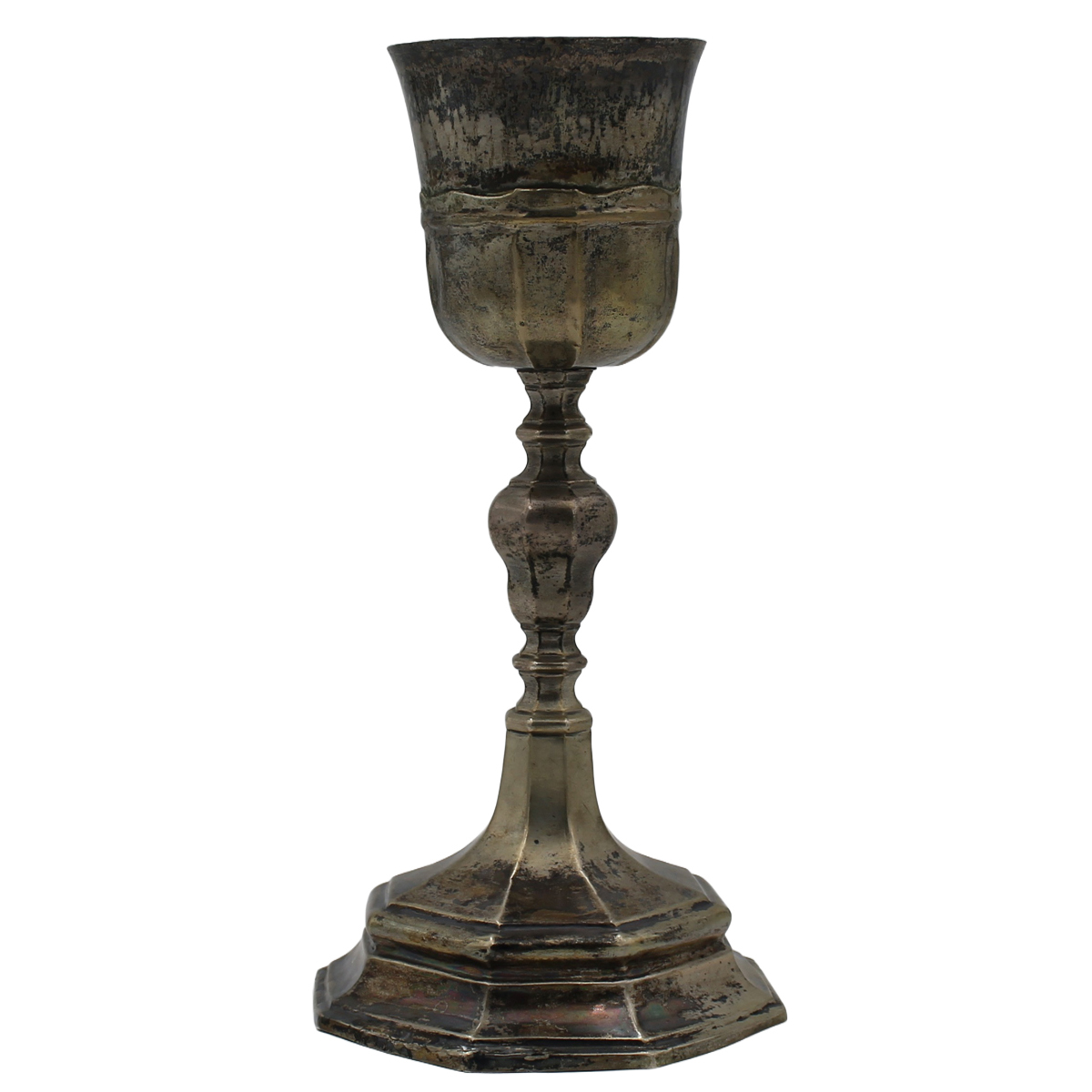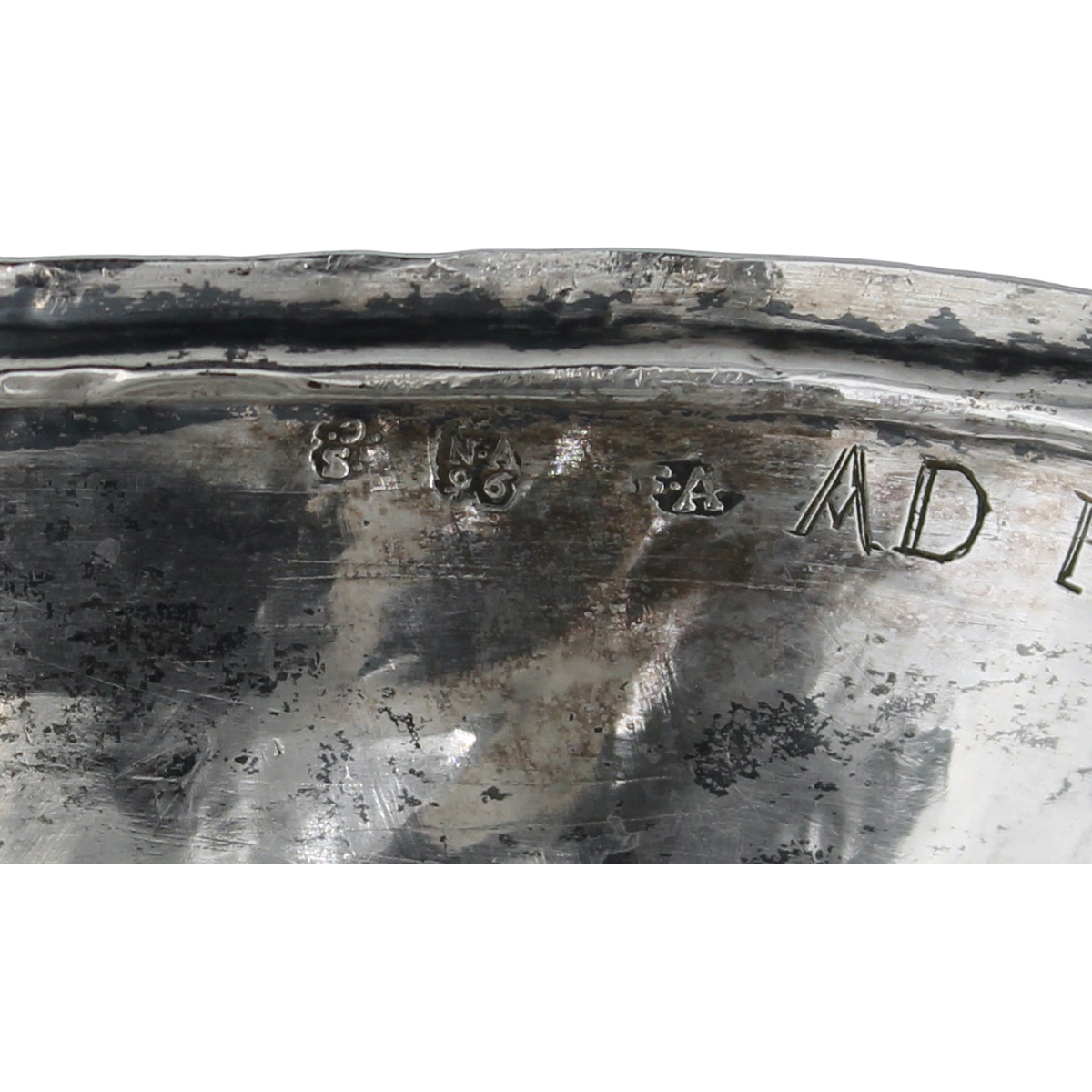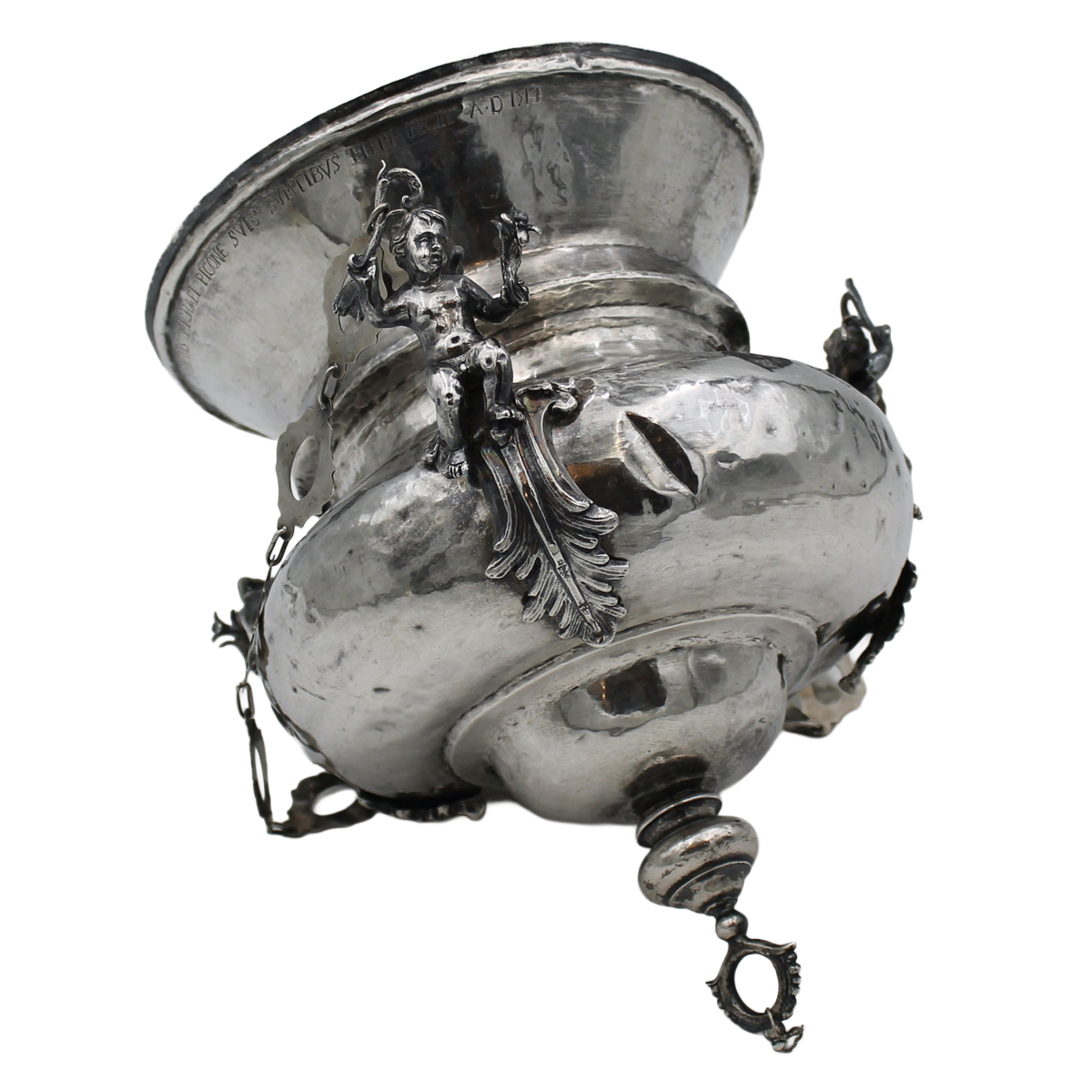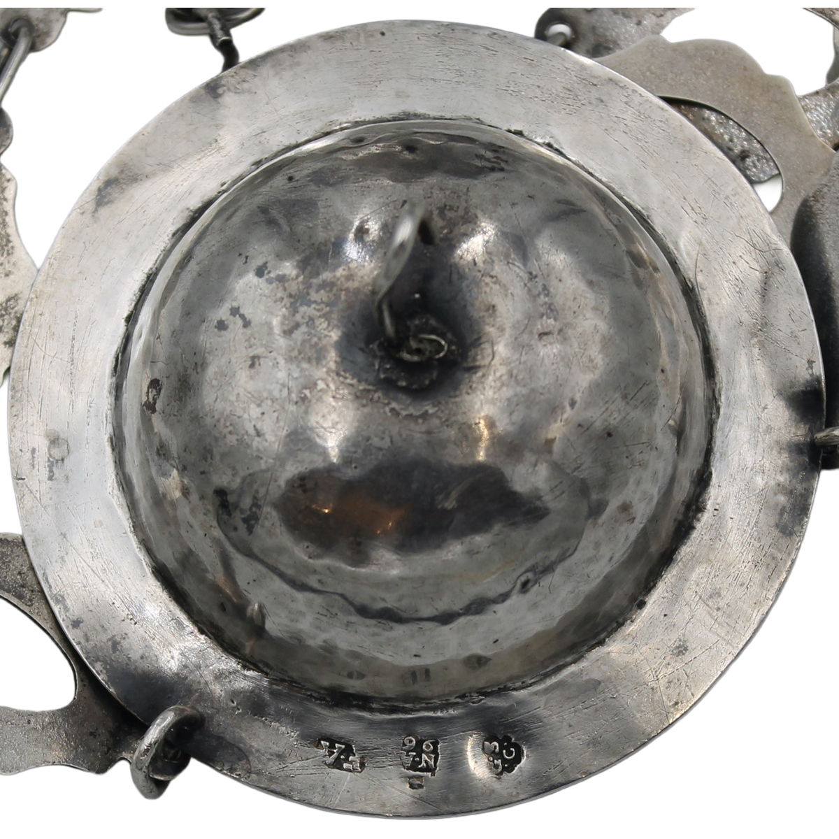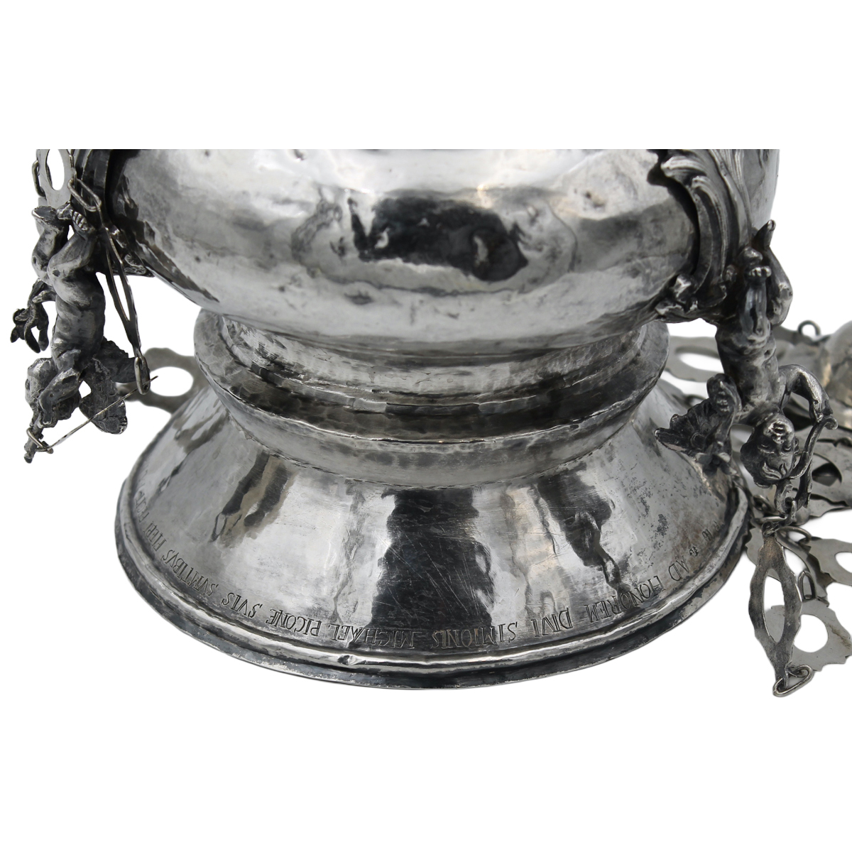 € 1.200Antico argento sbalzato con putti sui laterali. Napoli. 1798(?). Cm h 27 (lampada senza catena); cm h 87 (comprensiva di catena). Peso gr. 1.068