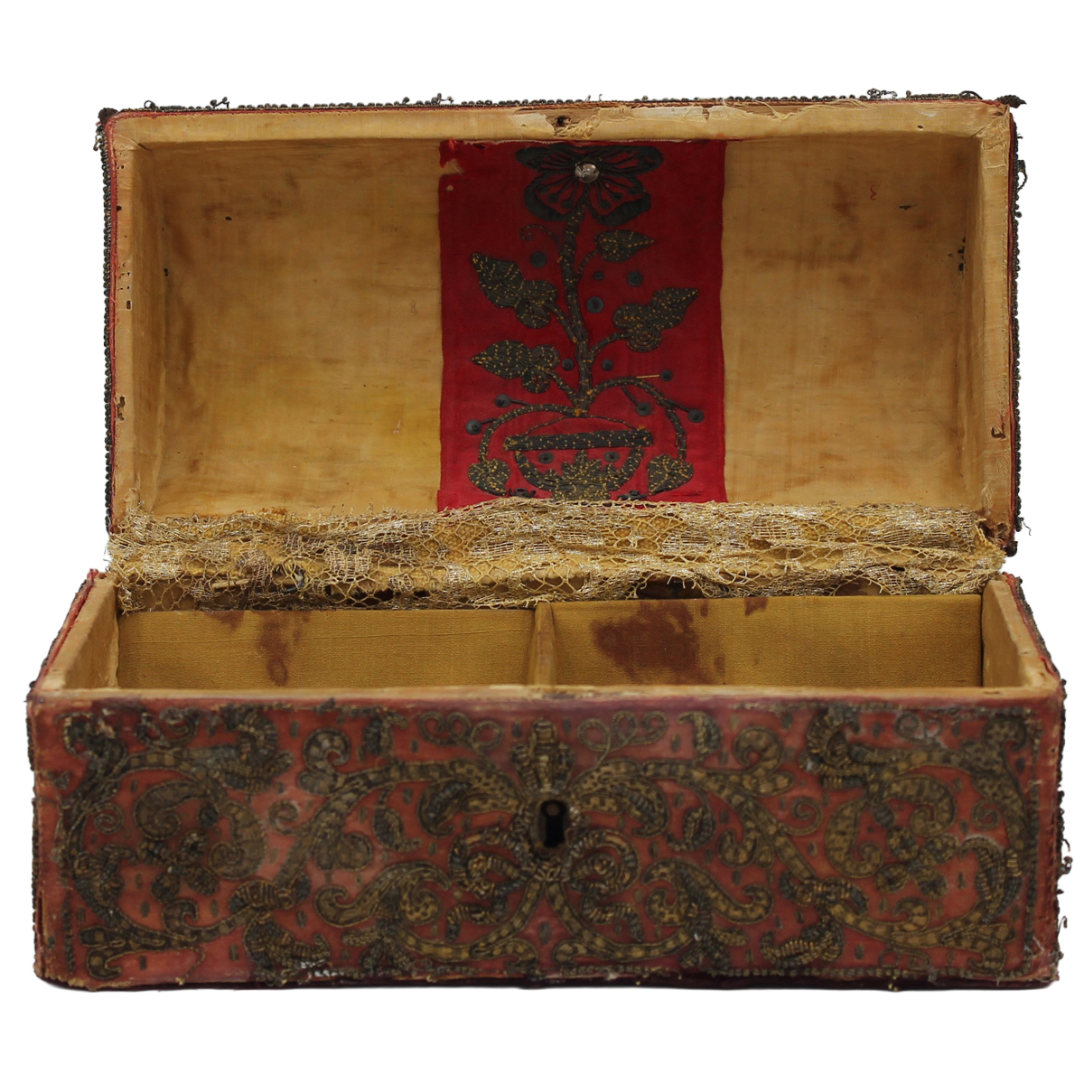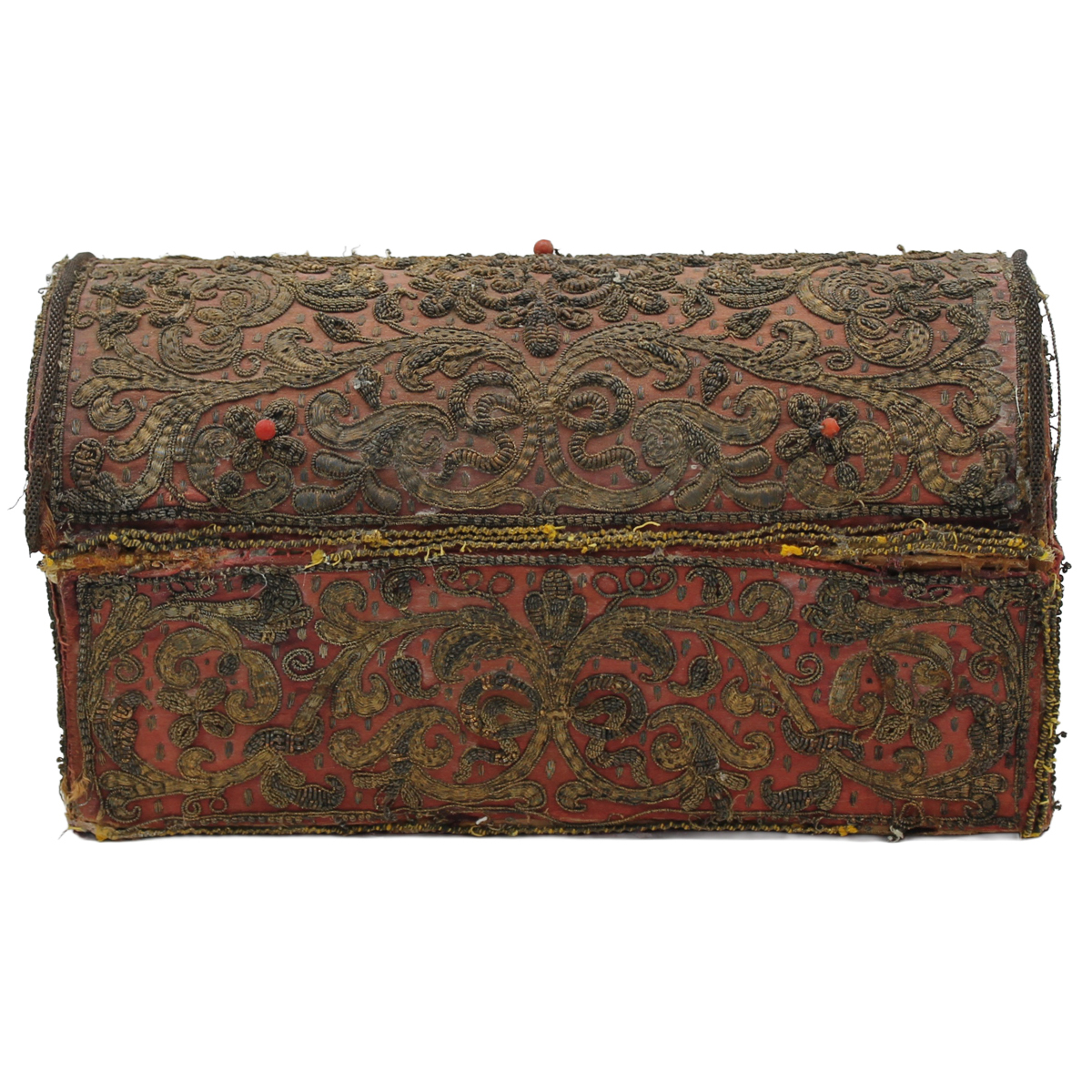 € 200Rivestito in stoffe finemente ricamate a filo d'oro con applicazioni di perle e corallo. Sicilia. Fine secolo XVIII. Cm 24x12 h14