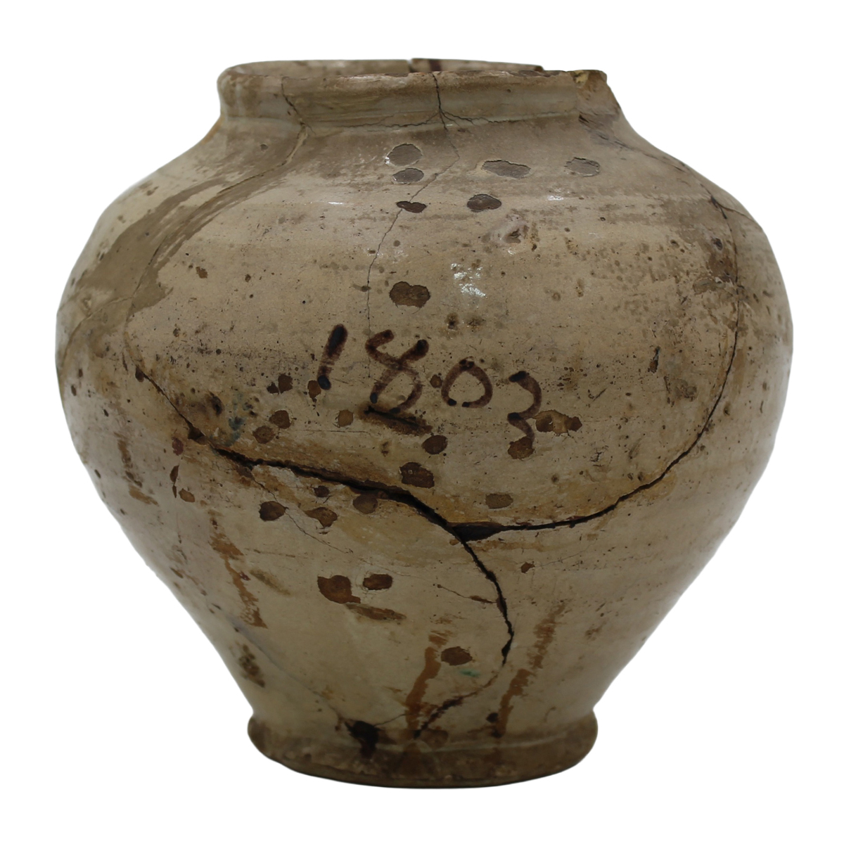 € 80Antica maiolica con decoro frontale con profilo di soldato a motivi ornamentali policromi su fondo crema (varie rotture e incollaggi). Caltagirone. Datata 1803. Cm h 18,5