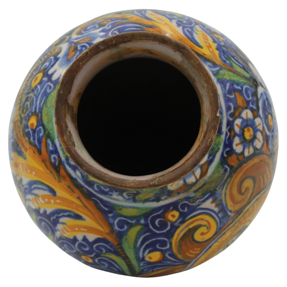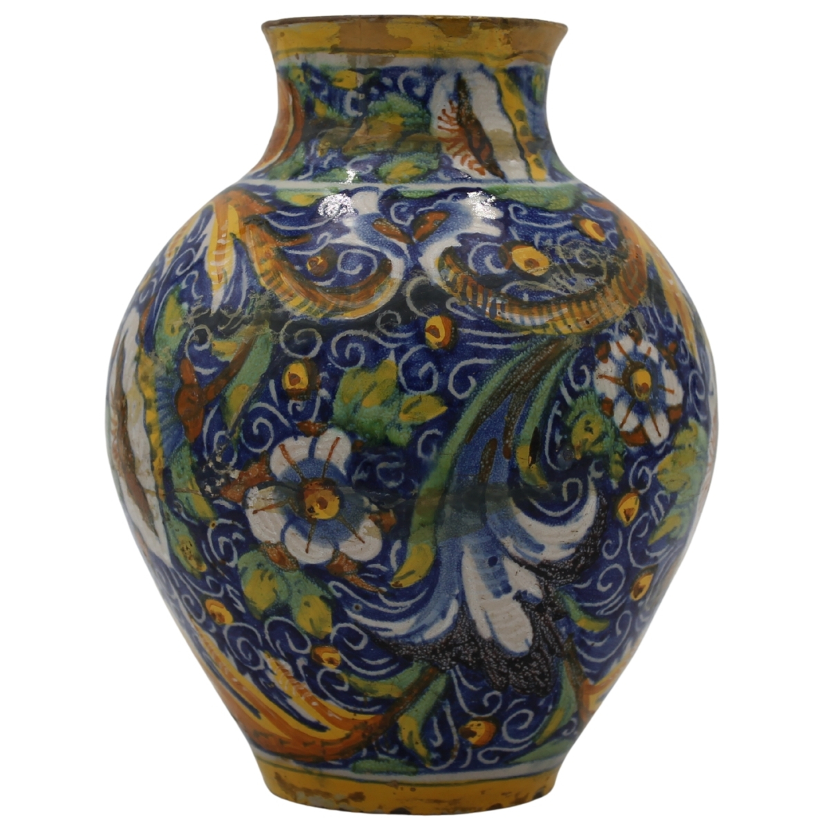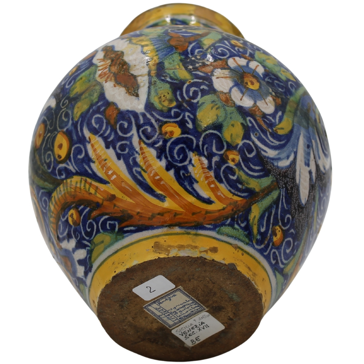 € 1.800Antica maiolica con medaglione centrale raffigurante la Maddalena e decoro a tutto tondo a motivi floreali e vegetali policromi (restauri al collo e rastauri nella parte centrale). Venezia. Secolo XVII. Cm h 24,5
