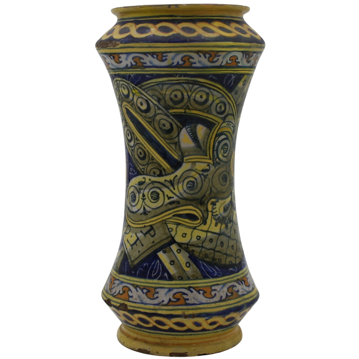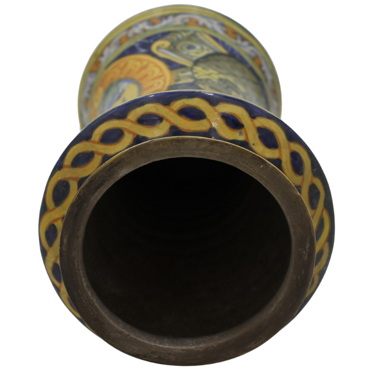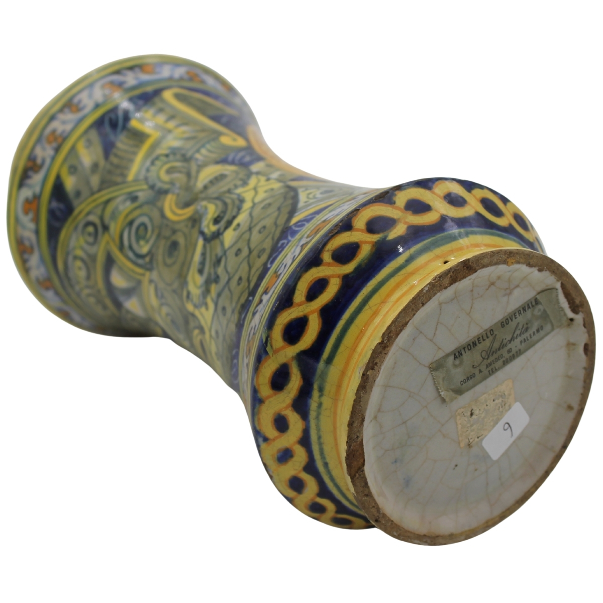 € 1.500Antica maiolica decorata con medaglione centrale raffigurante figura di santa e sul retro trofei e decorazioni ornamentali policrome (lievi restauri sul collo). Palermo. Secolo XVII. Siglata. Cm h 29,5