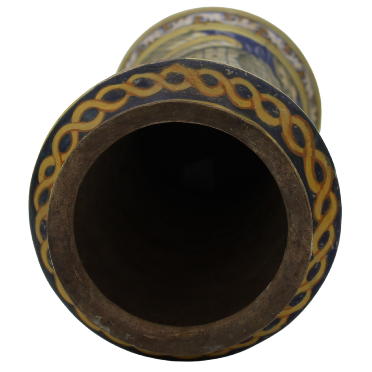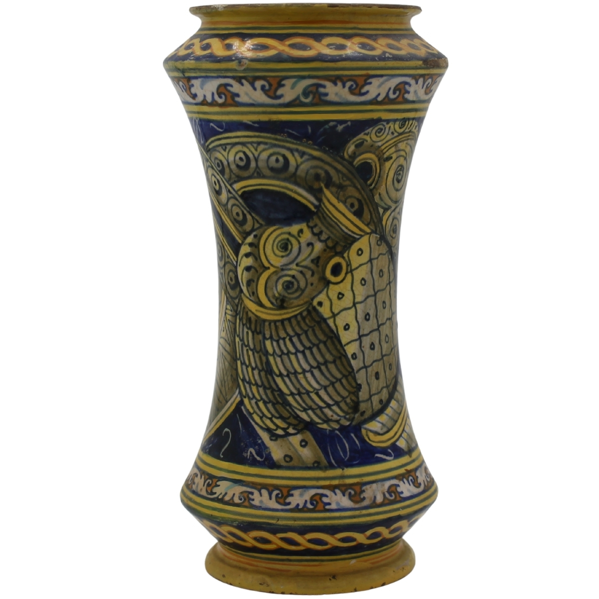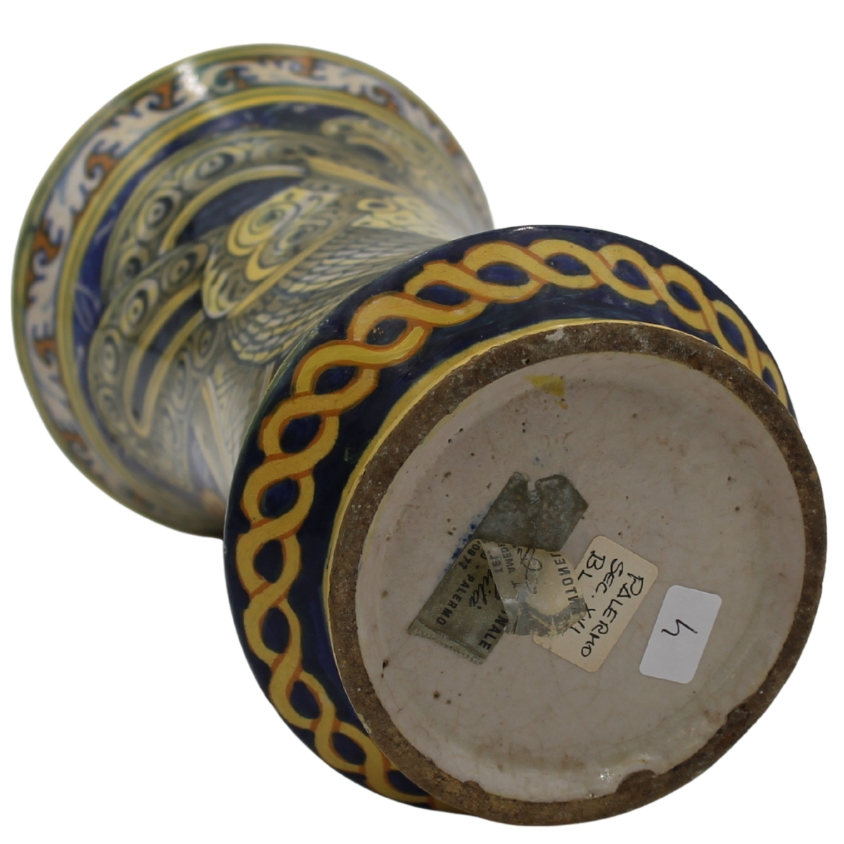 € 1.500Antica maiolica decorata con medaglione centrale raffigurante santo e sul retro ricco decoro a trofei policromi (lievi restauri). Palermo. Secolo XVII. Cm h 30