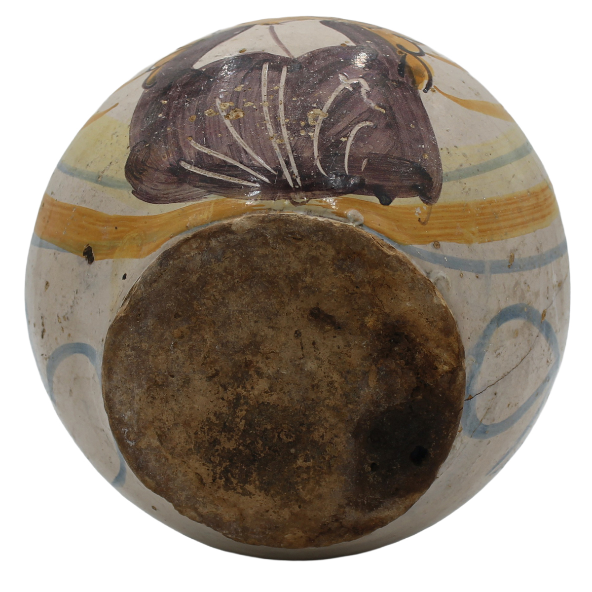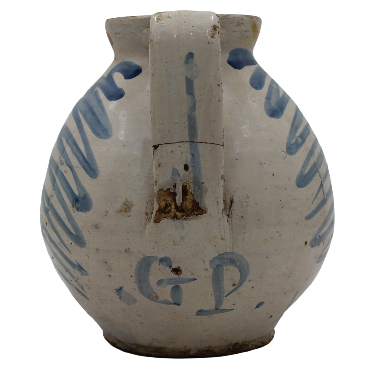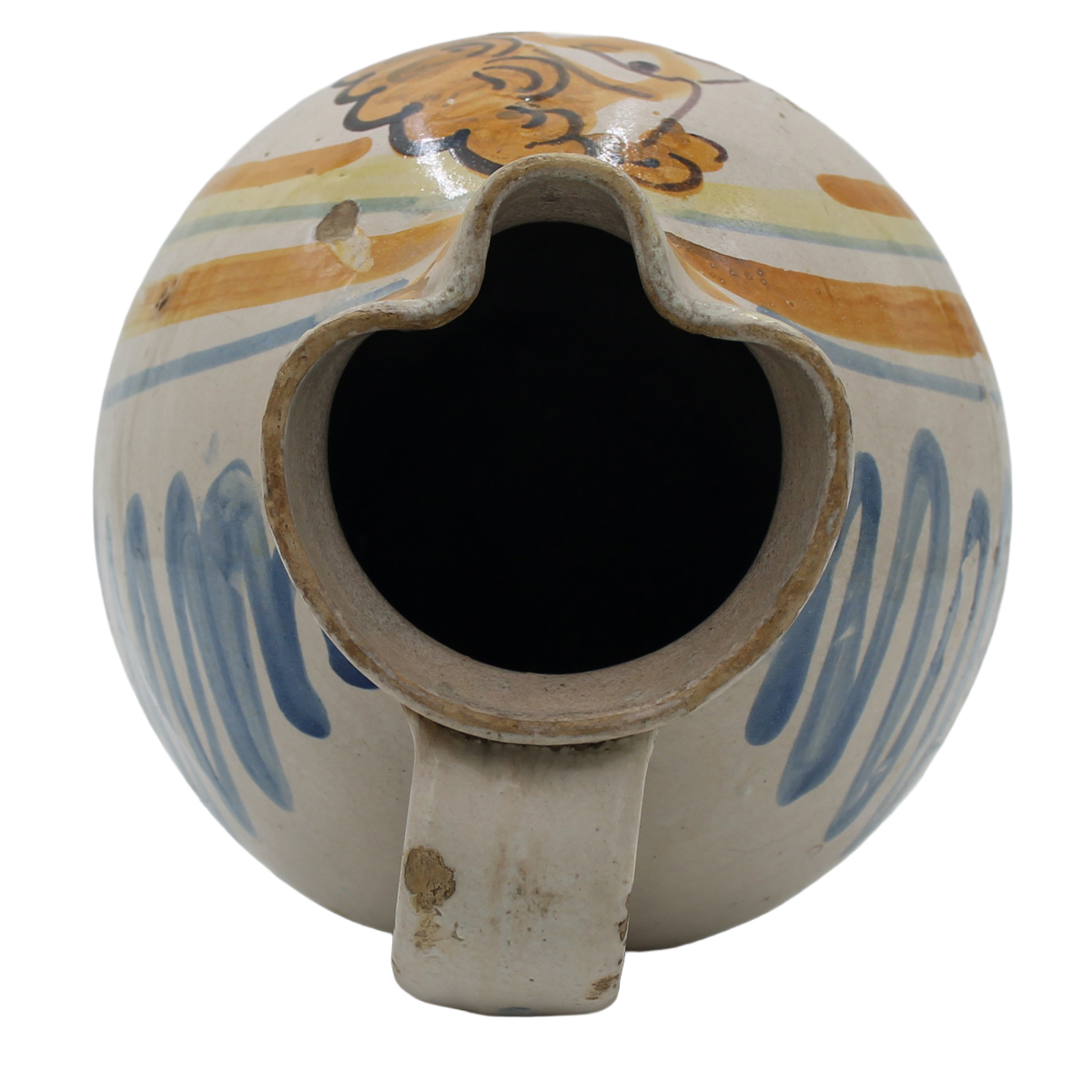 € 200Antica maiolica con profilo di uomo sul fronte e decoro a motivi ornamentali policromi (danni al manico e failiure nella parte bassa). Siglata sul retro G.P. Italia meridionale. Secolo XIX. Cm h 25